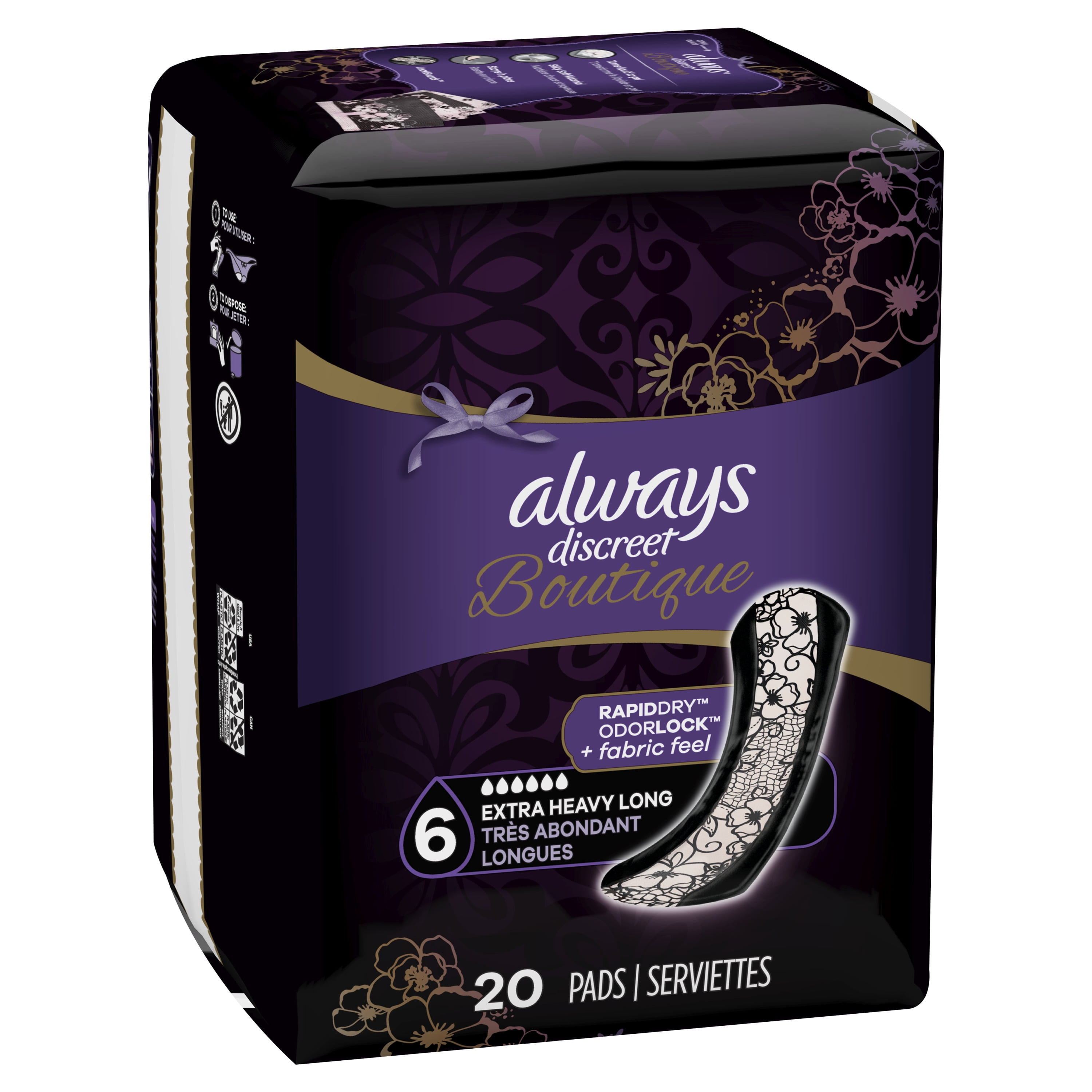 With Always Discreet Boutique Incontinence Pads, bladder leaks don’t get in the way of feeling your best. Discover incredible bladder leak protection that feels like your favorite underwear, thanks to its fabric-like material. A hidden core turns liquid to gel and locks away wetness, so you feel fresh and secure no matter what. Always Discreet Boutique lets you walk with poise and makes bladder leaks no big deal.Always Discreet Boutique offers incredible protection with a fabric-like feelMade differently – Turns liquid to gel and locks it awayFlexible and discreet design for a smooth fit under clothesHelps stop leaks at edgesNumber one combination of protection and softness within the Always Discreet rangeAlways Discreet Boutique Heavy Absorbency Pads are ideal for heavy leaks