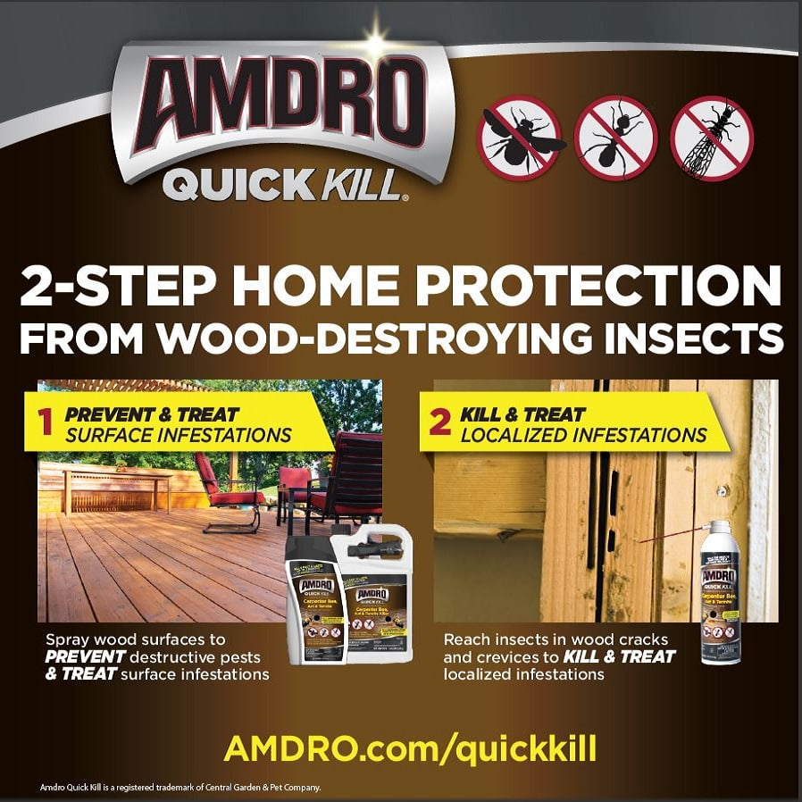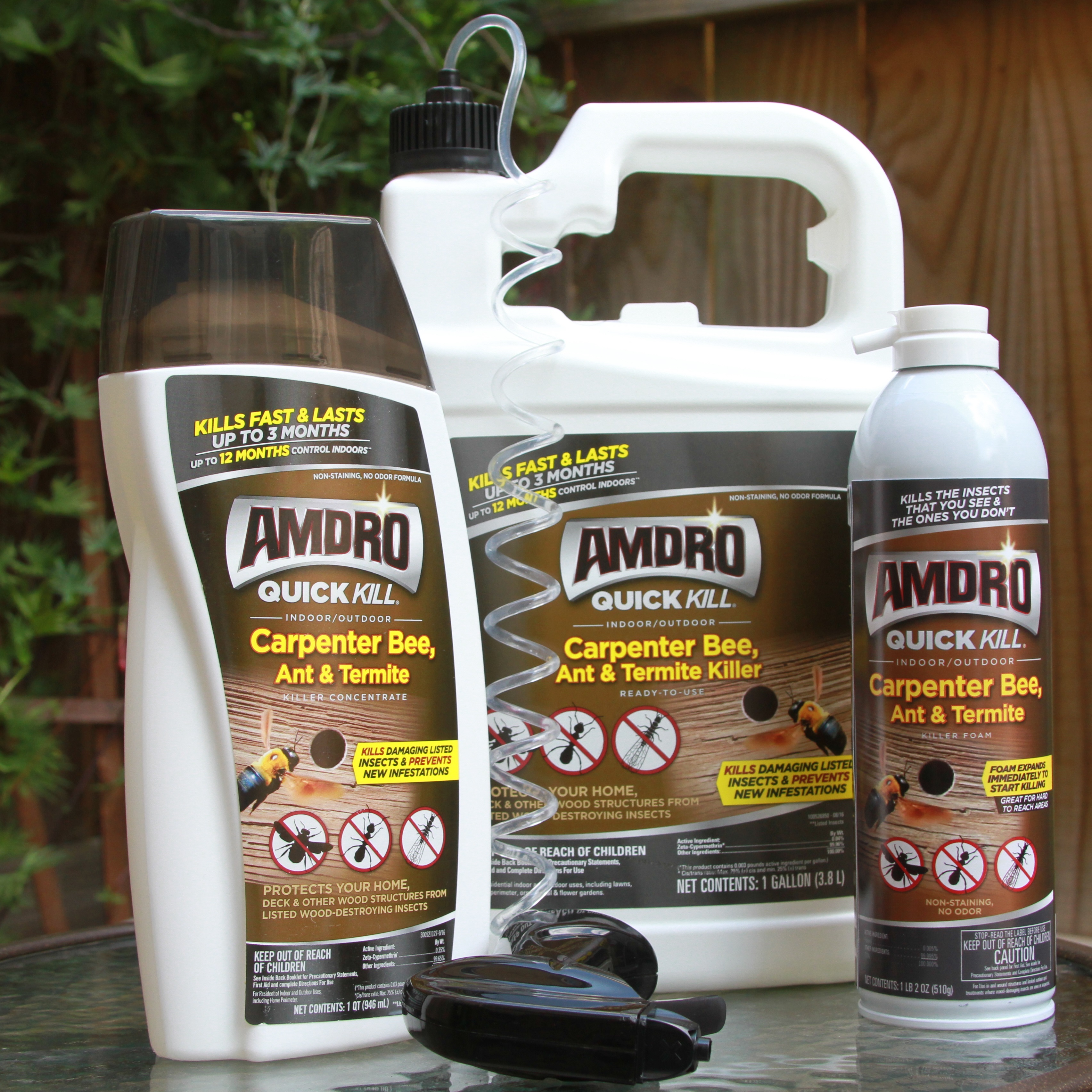 Amdro Quick Kill Carpenter Bee, Ant & Termite Killer 1 Gallon is a ready to use liquid. This product targets all wood damaging pests including the three major wood pests in the United States: Carpenter Bees, Carpenter Ants & Termites. Simply set up the trigger sprayer and apply product on perimeter wood surfaces such as wooden fencing, wooden porches, wooden siding and wooden patio. This product works fast and outdoors and up to 12 months indoors. Protect your home, deck & other wood structures from listed wood-destroying insects from carpenter bees, carpenter ants and termites. This product is specially formulated with no odor and non-staining. This product is not for use on plants. It is intended for use as a perimeter treatment only. Children and pets can re-enter the treated area after the product has dried.