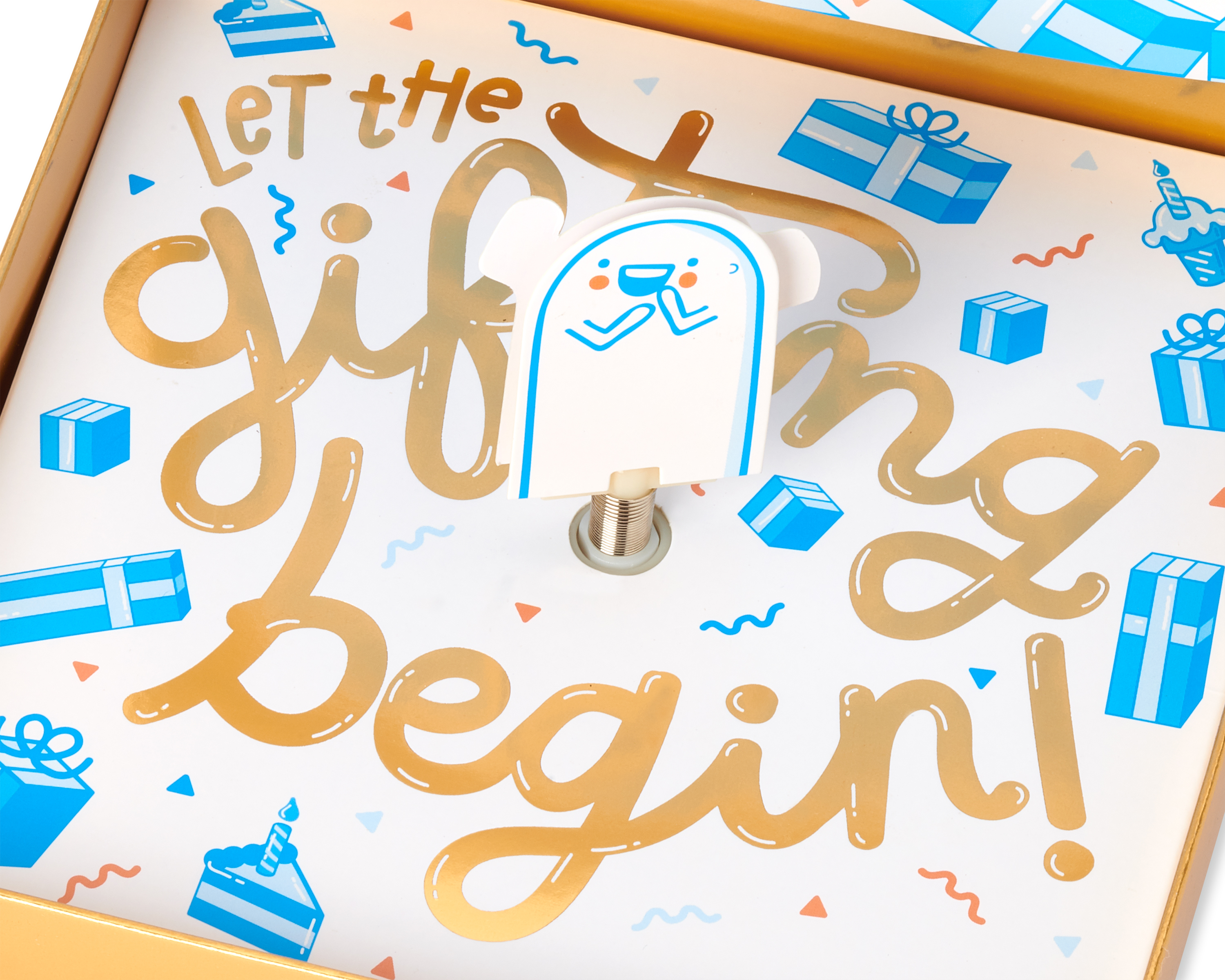 Deliver birthday gifts that dazzle with this innovative gift card holder featuring a keepsake box with gold foil accents that open to reveal a musical, spinning gift card. The box plays the song ‘Oh Yeah’ in high-quality audio for funny birthday wishes. Simply place your gift card into the clip provided, close the box and share to make anyone’s day super special!