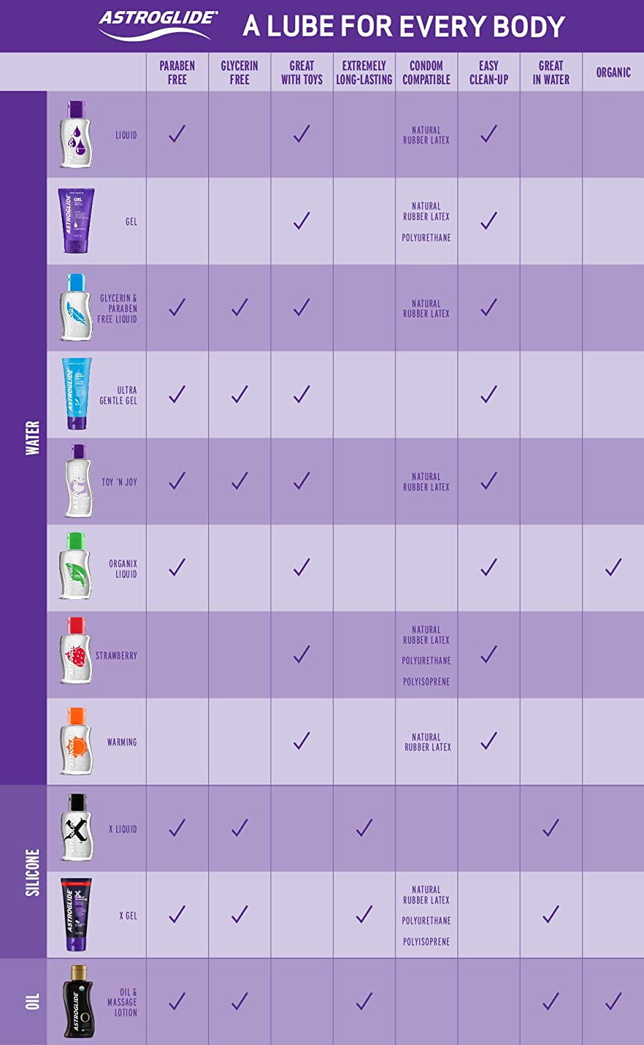Your pleasure is our business: We exist to inspire any and every individual to explore pleasure and intimacy unlike any other with our products. As one of the world’s top-selling personal lubricants, Astroglide creates smooth, long-lasting sexual experiences with our trade secret formula that provides the highest level of slipperiness and retains its lubricating property.