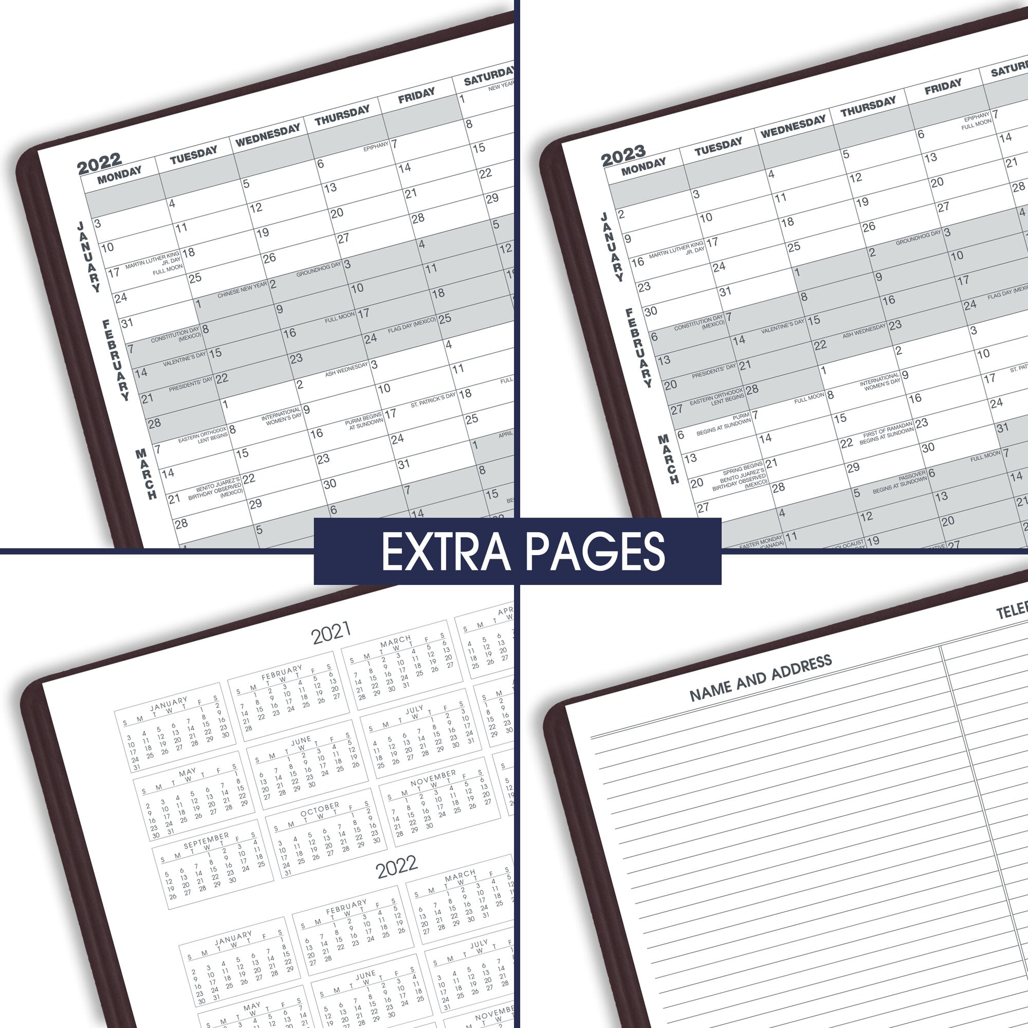 - One month per two page spread with unruled daily blocks. Past, current and 4 future month reference calendars for quick date checking.