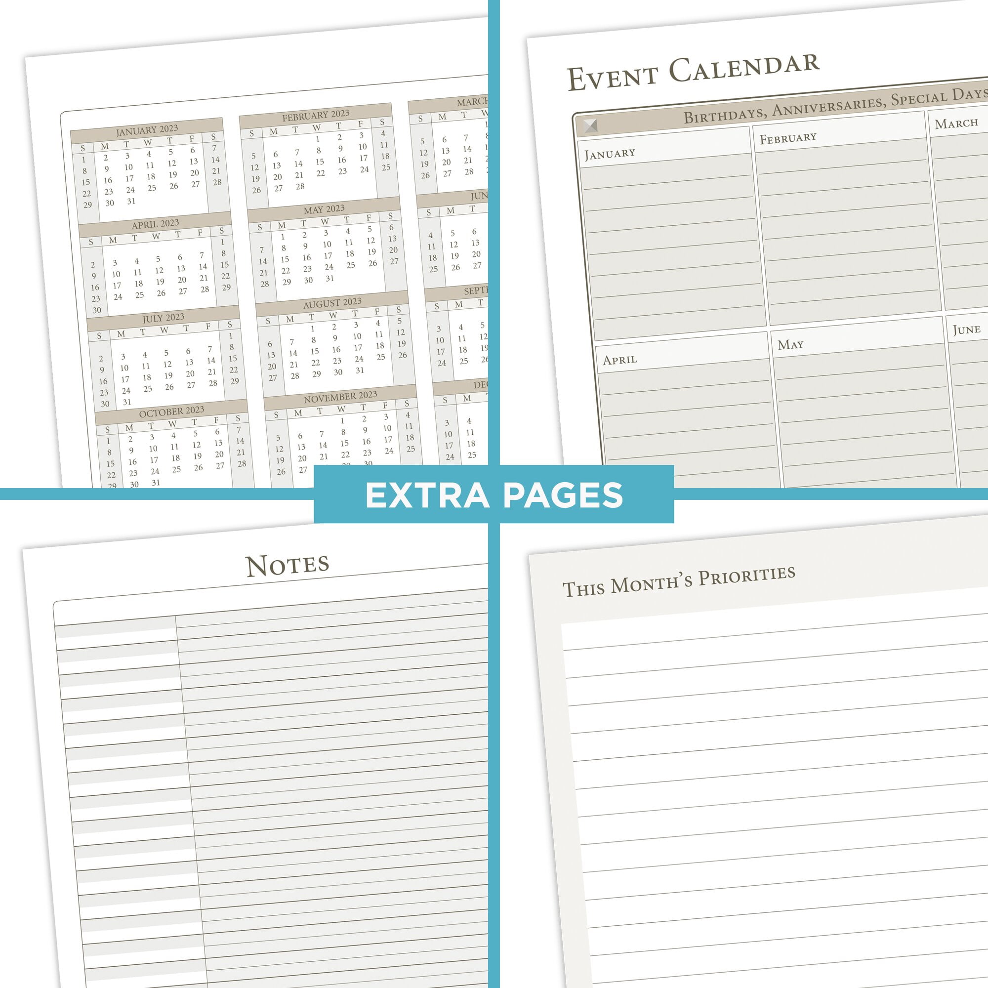 - Tabbed one month per two page spreads feature ruled daily blocks for detailed planning and a column for notes
