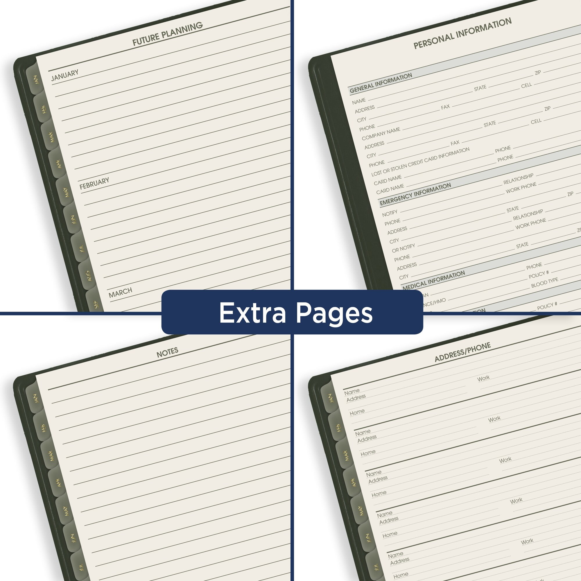- One month per two page spread has unruled daily blocks and past, current and four future months calendar reference