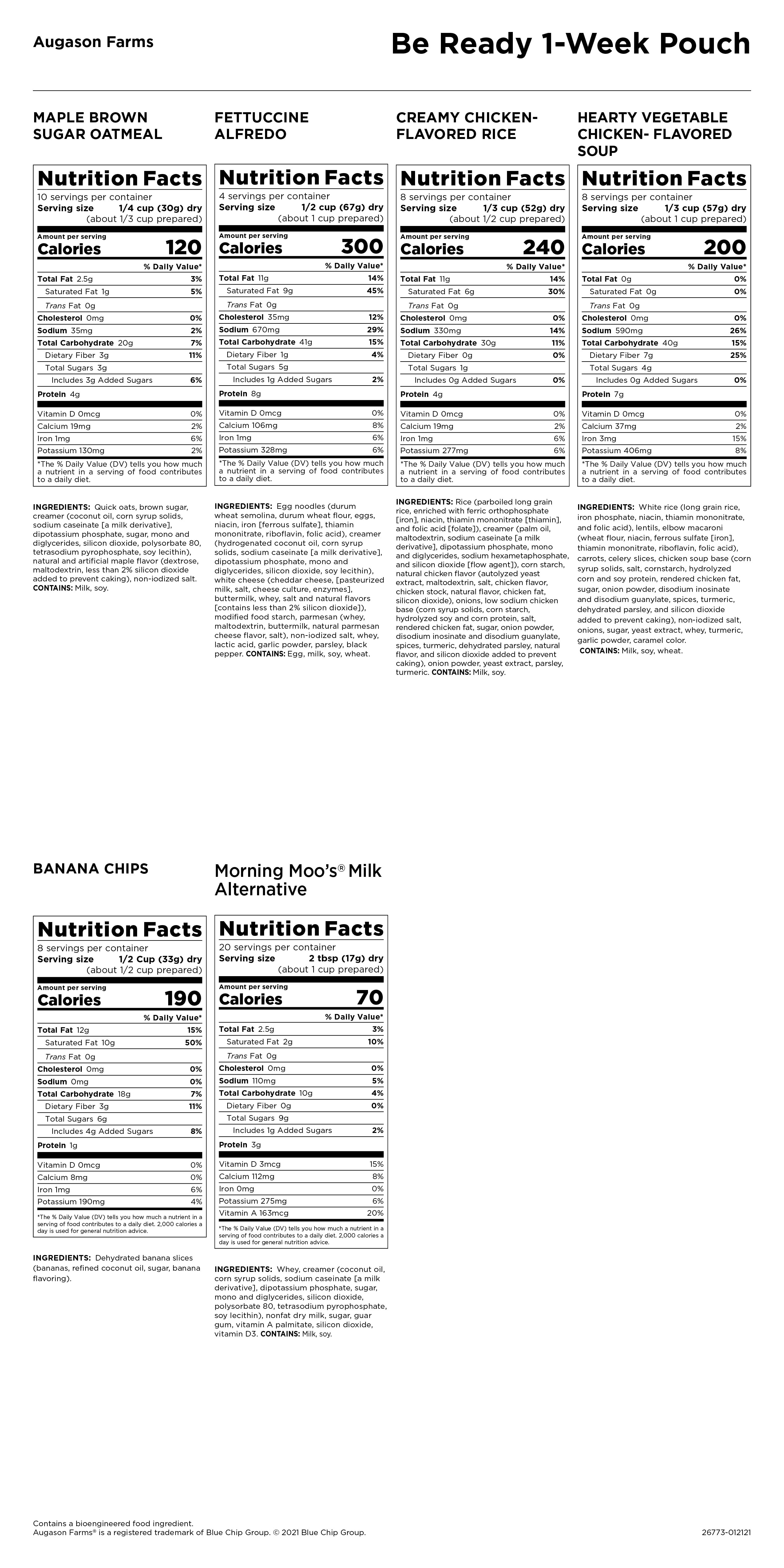 Augason Farms BE READY™ Emergency Meal kits are designed for affordability and convenience—not to mention great flavor—so you can always be prepared with survival food in every location you spend time. Places like home, workplace, automobile, RV, cabin, boat, and second home are critical locations for an emergency food supply. And don’t forget to prepare your college students by sending them off to school with BE READY kits for their vehicles and dorm rooms. The BE READY™ 1-Week food supply weighs just under five pounds and is small enough to store in cars, trucks, coat closets, motorcycle saddlebags, and more. To prepare your freeze-dried emergency food, simply add water and simmer, and you’ll have hot meals to satisfy your appetite and warm your soul. To boost the calories and service in this food supply, add vegetables and meats or meat substitutes. FOOD SUPPLY INCLUDES: Morning Moo’s Lowfat Milk Alternative (1 pouch/20 servings), Maple Brown Sugar Oatmeal (1 pouch/10 servings), Hearty Vegetable Chicken-Flavored Soup (1 pouch/8 servings), Fettuccine Alfredo (1 pouch/4 servings), and Creamy Chicken-Flavored Rice (1 pouch/8 servings), and Banana Chips (1 pouch/8 servings). Based on storage conditions, Augason Farm’s freeze-dried emergency food has an up to 25-year shelf life.