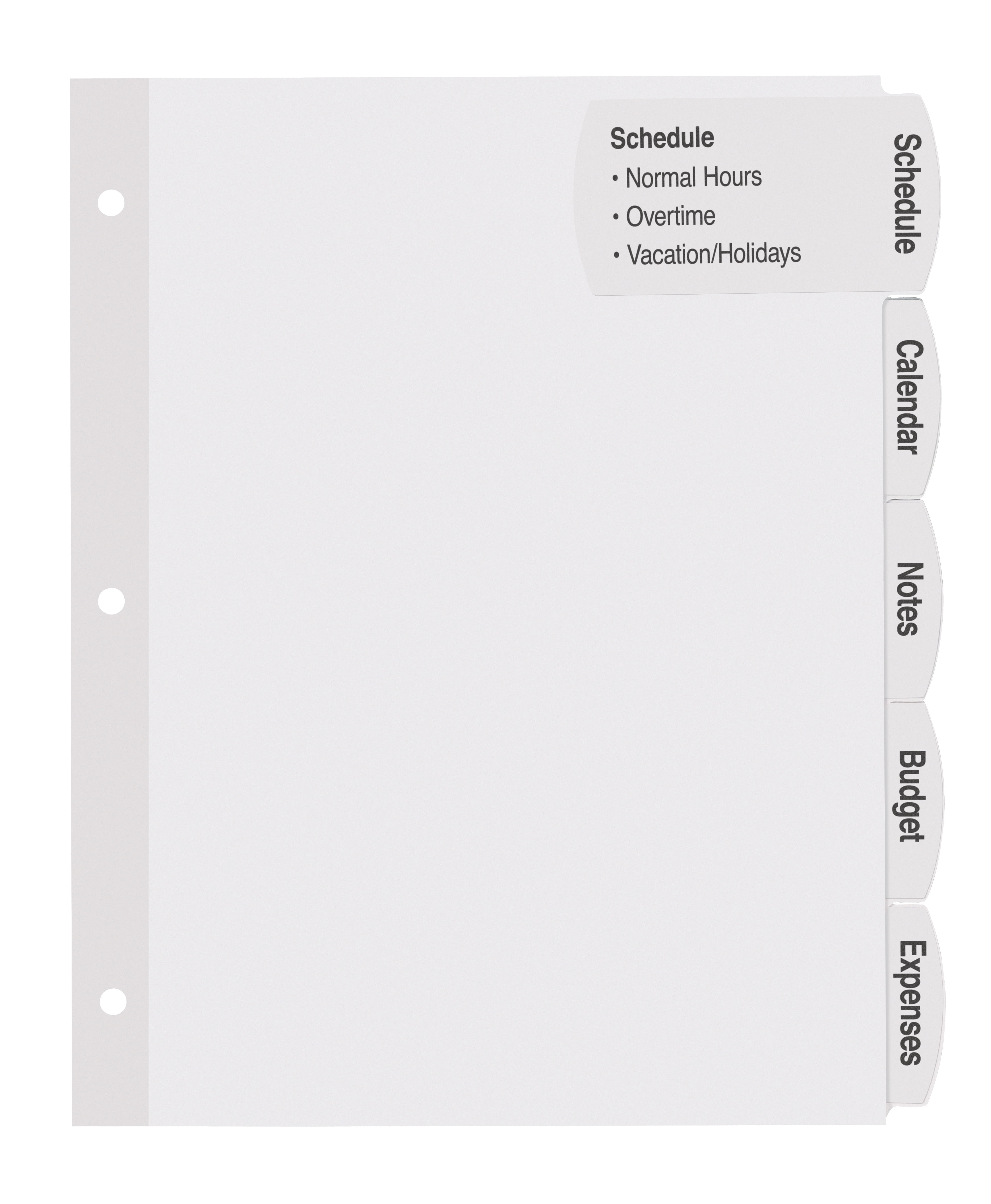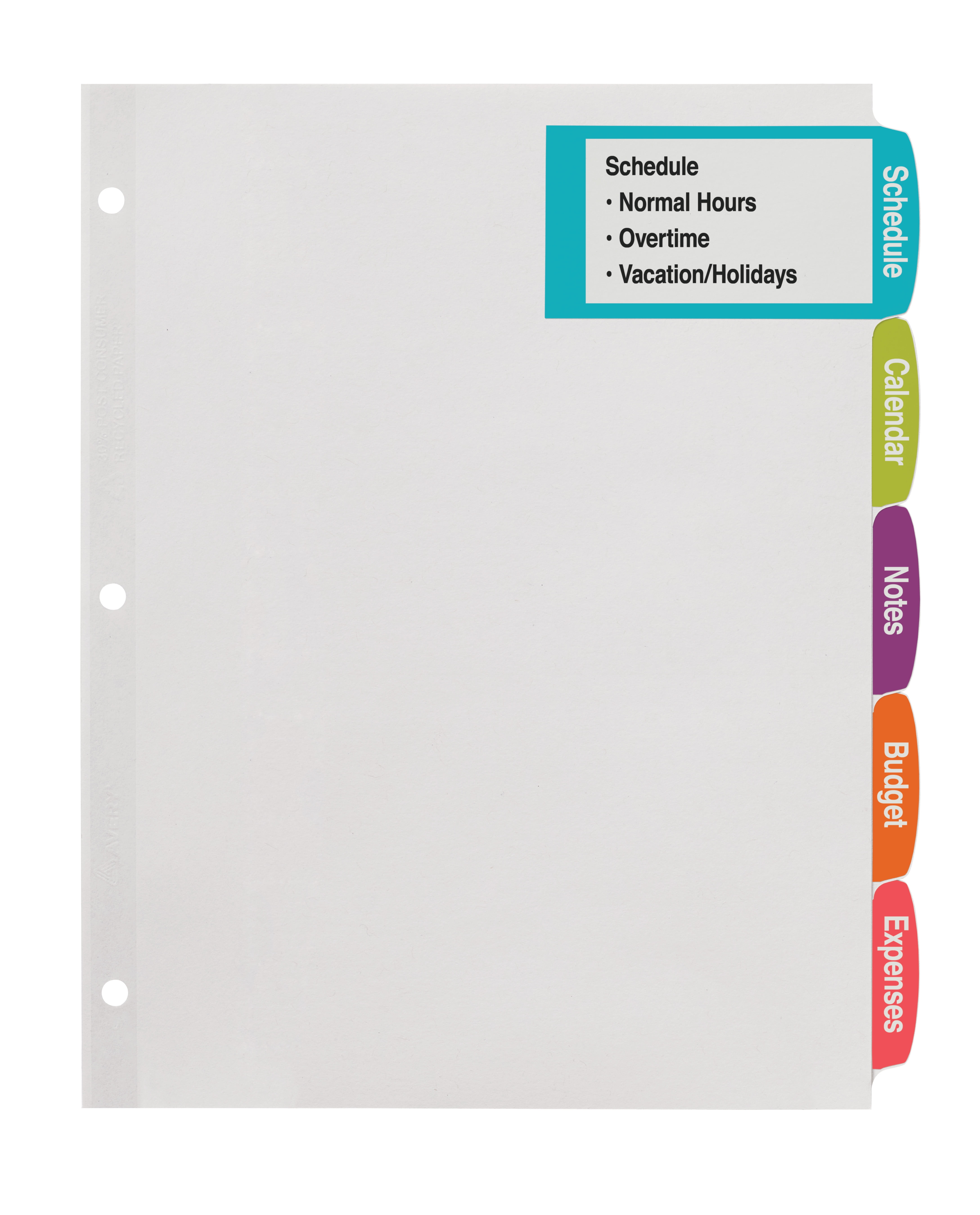 Create customized dividers with all the information you need, using these Large White Label Tab Dividers. The large labels extend from the arched-shaped tabs onto the divider bodies, giving ample room to add section contents, logos or designs. Simply personalize your tab labels using our free templates and designs at avery.com/print. You can print your labels in black and white, or create a custom color set, using a laser or inkjet printer. The print-to-the-edge Easy Peel labels, featuring our Pop-Up Edge, make it fast and simple to personalize your tabs, with no inserts required. You simply bend back the label sheet, peel your label and apply to the divider tabs. A bonus standard label sheet is included for the back of your tabs.