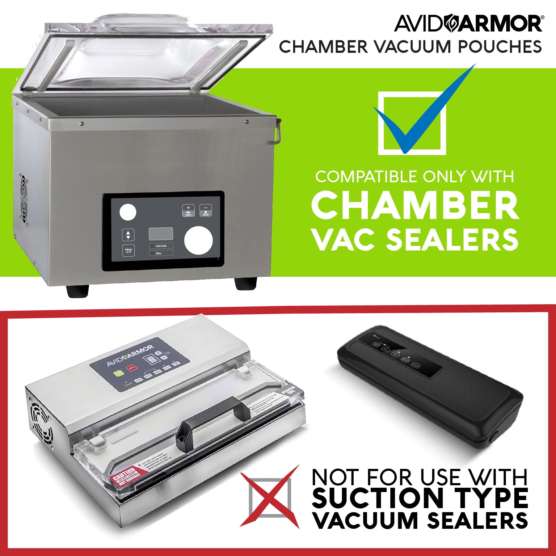 Avid Armor chamber vacuum pouches are manufactured with a professional grade multi-layer poly nylon construction. This helps block moisture and oxygen to prevent food dehydration and freezer burn. Our pouches are BPA Free and designed for any chamber vacuum sealer. Avid Armor chamber sealer bags are 3-mil thick helping extend food product shelf life and making them sous vide safe. This envelope style pouch has an opening on the long 11" side making it effortless to load food into the pouch. Note: Chamber vacuum bags are not compatible with food saver type vacuum sealers. Chamber pouches will only work with chamber sealer machines.