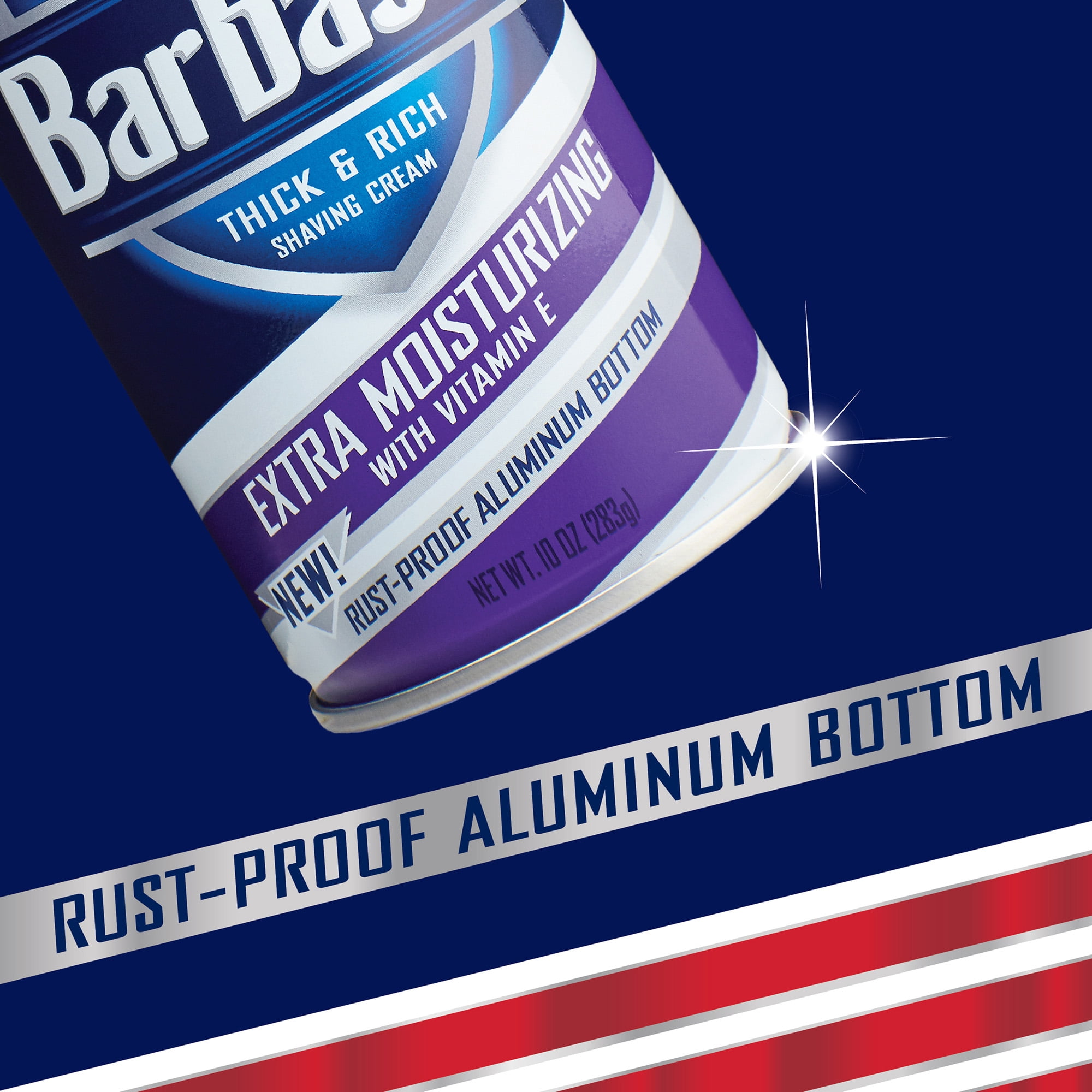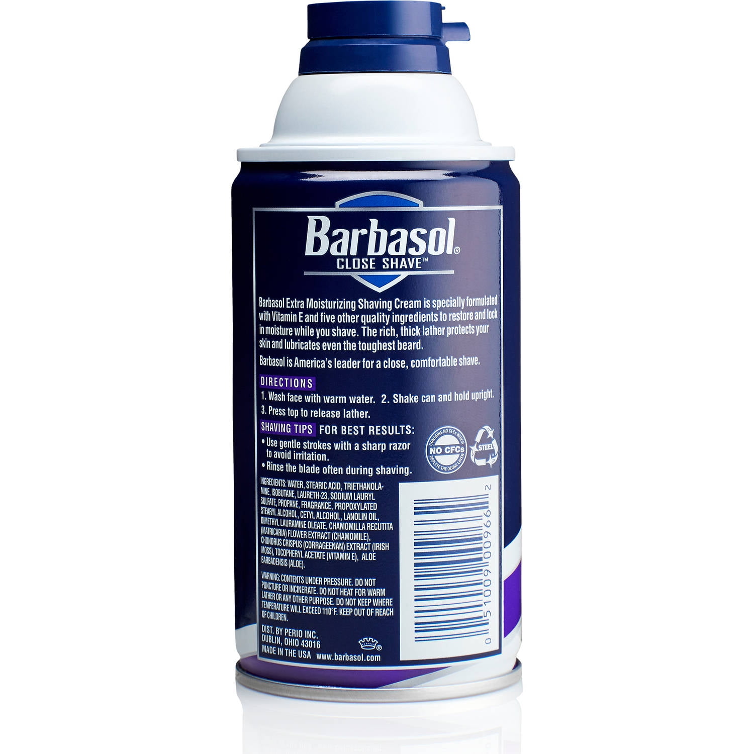 Barbasol Extra Moisturizing Shaving Cream is formulated specifically to restore and lock in moisture with vitamin E, aloe, lanolin and other moisturizing ingredients. The premium Close Shave formula delivers exceptional razor glide to minimize irritation and produces a rich, thick lather that moisturizes and lubricates even the toughest facial hair. Barbasol Shaving Cream gives you the confidence that comes from a close, comfortable shave. Barbasol Shaving Cream is available in cans with rust-proof aluminum bottoms. Each pack includes six 10 ounce Barbasol Extra Moisturizing Shaving Cream cans. For best results, use with Barbasol razors. Thick and rich shaving cream formulated specifically to restore and lock in moisture with vitamin E, aloe, lanolin and other moisturizing ingredients; Moisturizes and lubricates even the toughest facial hair; Rust-proof aluminum bottom to prevent rust rings!; Protects skin while you shave. Warnings: Contents under pressure. Do not puncture or incinerate. Do not heat for warm lather or any other purpose. Do not store where the temperature may exceed 110 degrees Fahrenheit. Keep out of reach of children.