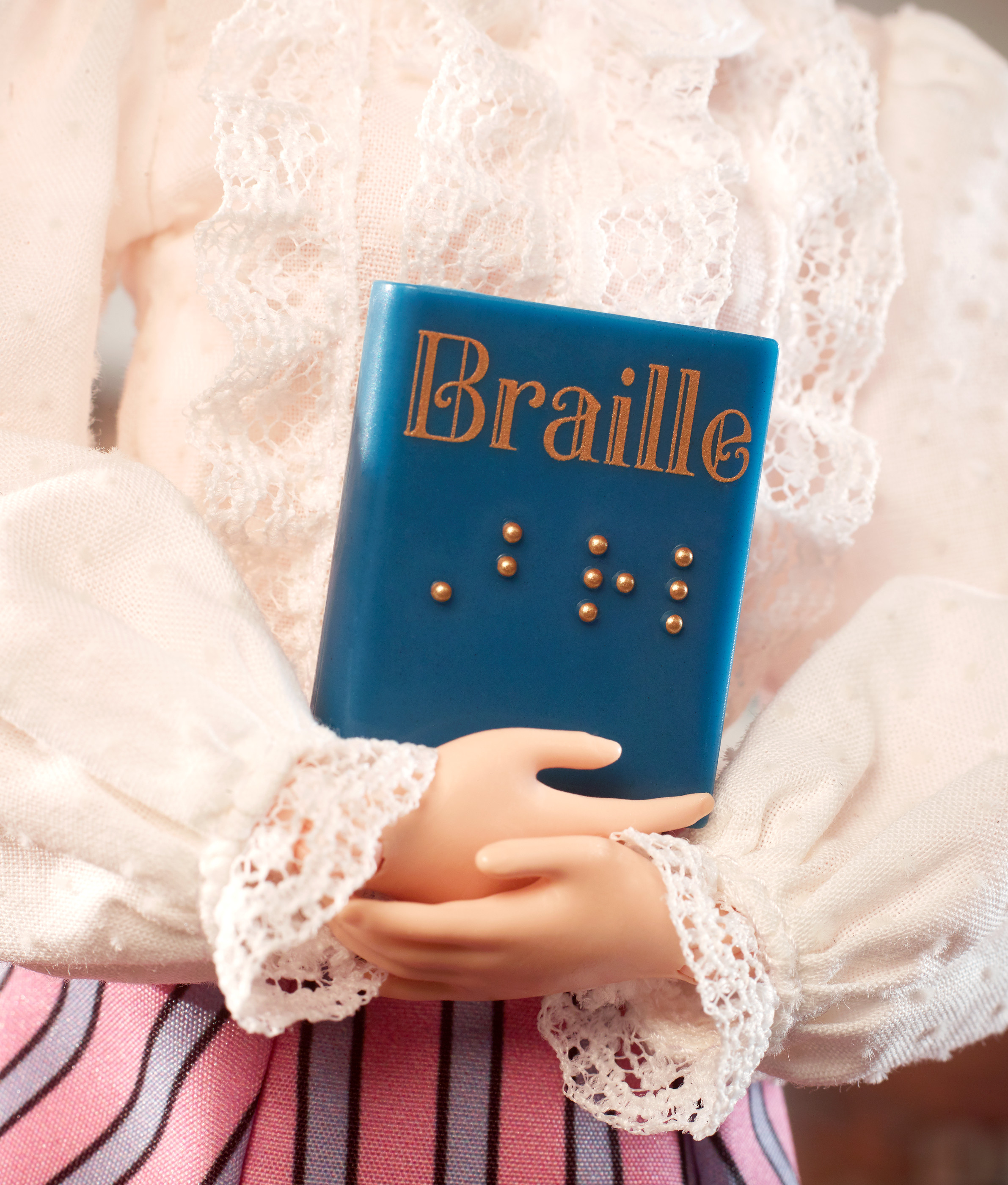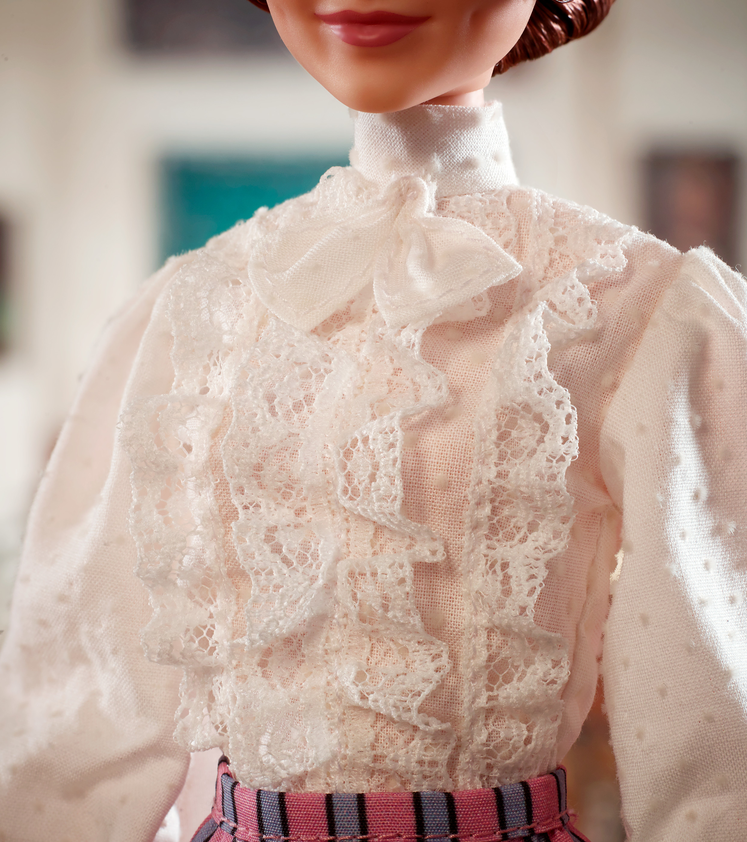- Helen Keller Barbie doll wears a striped skirt and blouse with ruffled lace details, inspired by Helen’s time as a student in the early 1900s