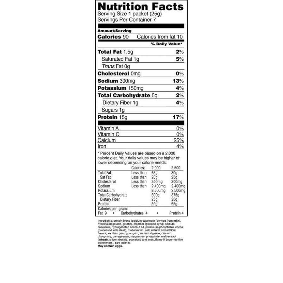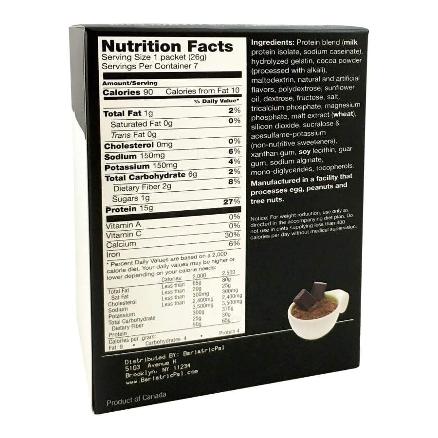 Ingredients: Protein Blend (milk protein isolate, sodium caseinate), Hydrolyzed Gelatin, Cocoa Powder (processed with alkali), Maltodextrin, Natural and Artificial Flavors, Polydextrose, Sunflower Oil, Dextrose, Fructose, Salt, Tricalcium Phosphate, Magnesium Phosphate, Malt Extract (wheat), Silicon Dioxide, Sucralose & Acesulfame-potassium (non-nutritive sweeteners), Xanthan Gum, Soy Lecithin, Guar Gum, Sodium Alginate, Mono-diglycerides, Tocopherols.BariatricPal Proti-15 Hot Drinks Hot Chocolate is a dream on cold days. This high-protein filling drink is rich and warming. You can make it with water or make it creamier by using hot milk or almond milk. You can even stir it into decaf or regular coffee for a rich creamy mocha treat that has way less sugar and calories than going to a coffee store. When you end your day with BariatricPal Proti-15 Hot Drinks Hot Chocolate you can go to bed satisfied knowing youre giving weight loss your all.Highlights:15 grams protein90 calories25% of the daily value for calciumSuitable for the Pre Op and Post Op Liquid Mushies and Pureed Foods Solid Foods and Maintenance dietsSuitable for gastric band gastric bypass and gastric sleeve patientsSuitable for anyone watching their weightEnjoy anytimeAspartame free7 xBariatricPal 15g Hot Chocolate Protein Drink Packest Per Box