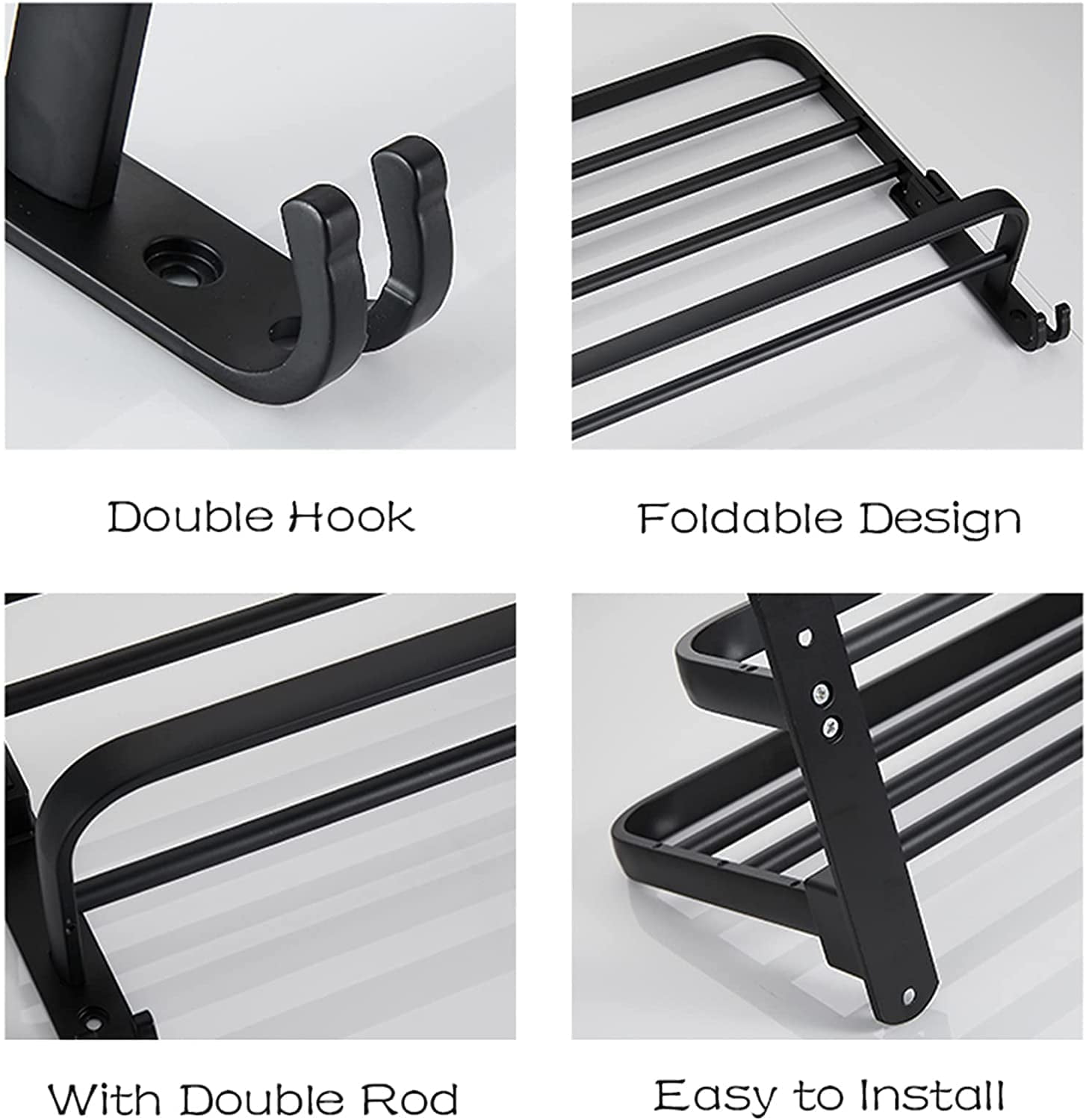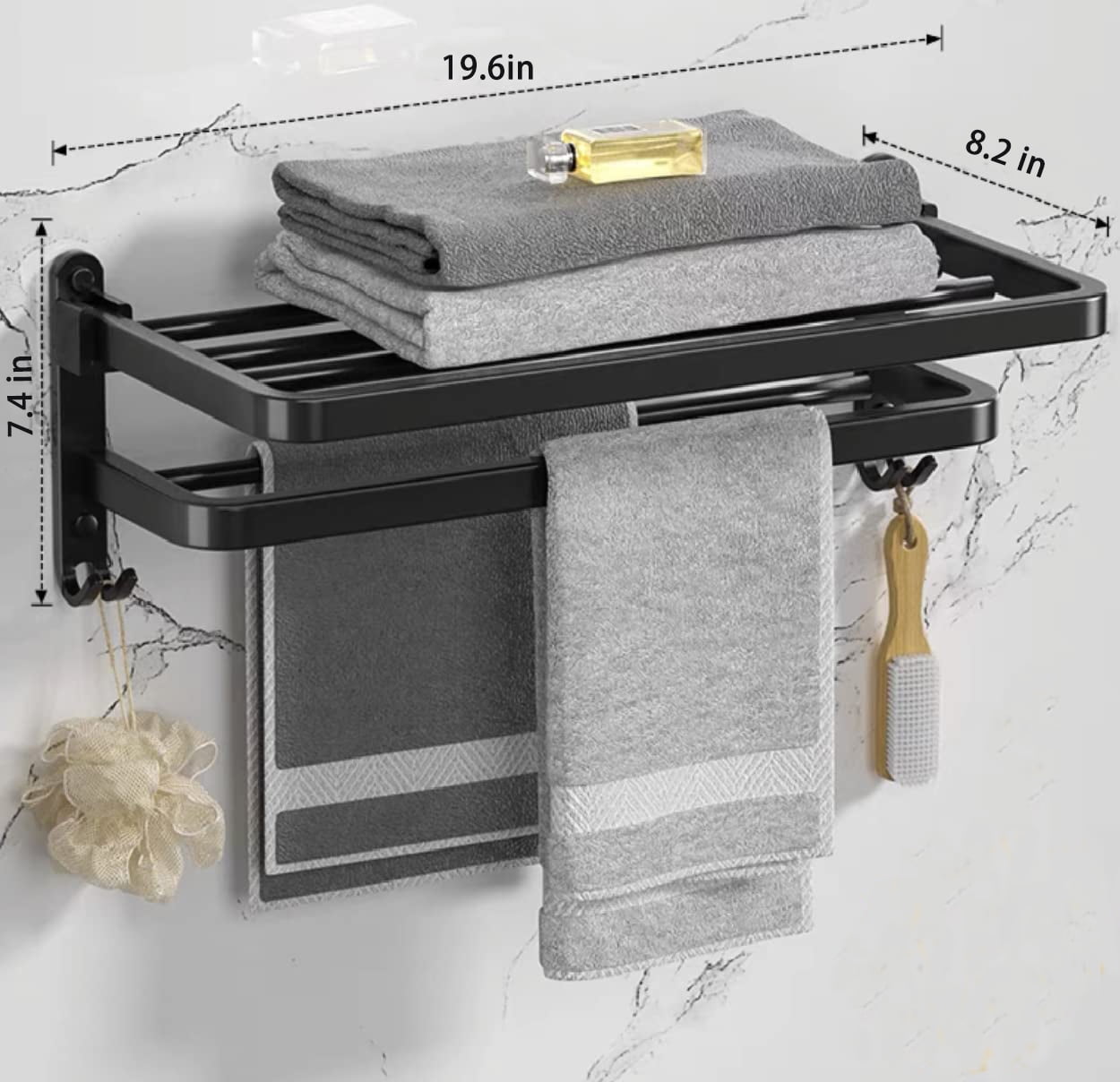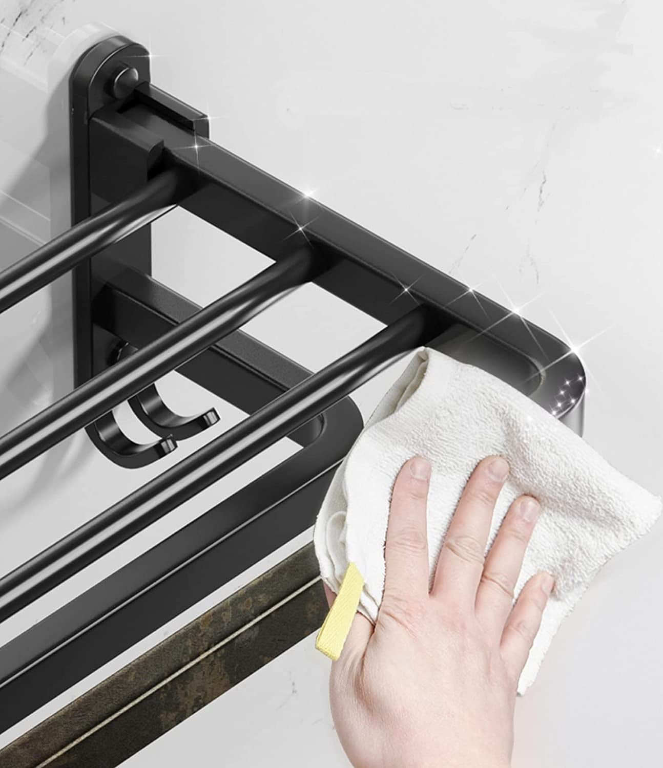 There are 2 hanging hooks on the side of the towel rack where you can hang things like body brush, shower loofah, sponge, etc. Easy to clean, just wipe with a soft cotton cloth to remove dust and moisture from the towel shelf. The towel rack can be folded against the wall when not in use, which saves space, and is stable and will not fall.