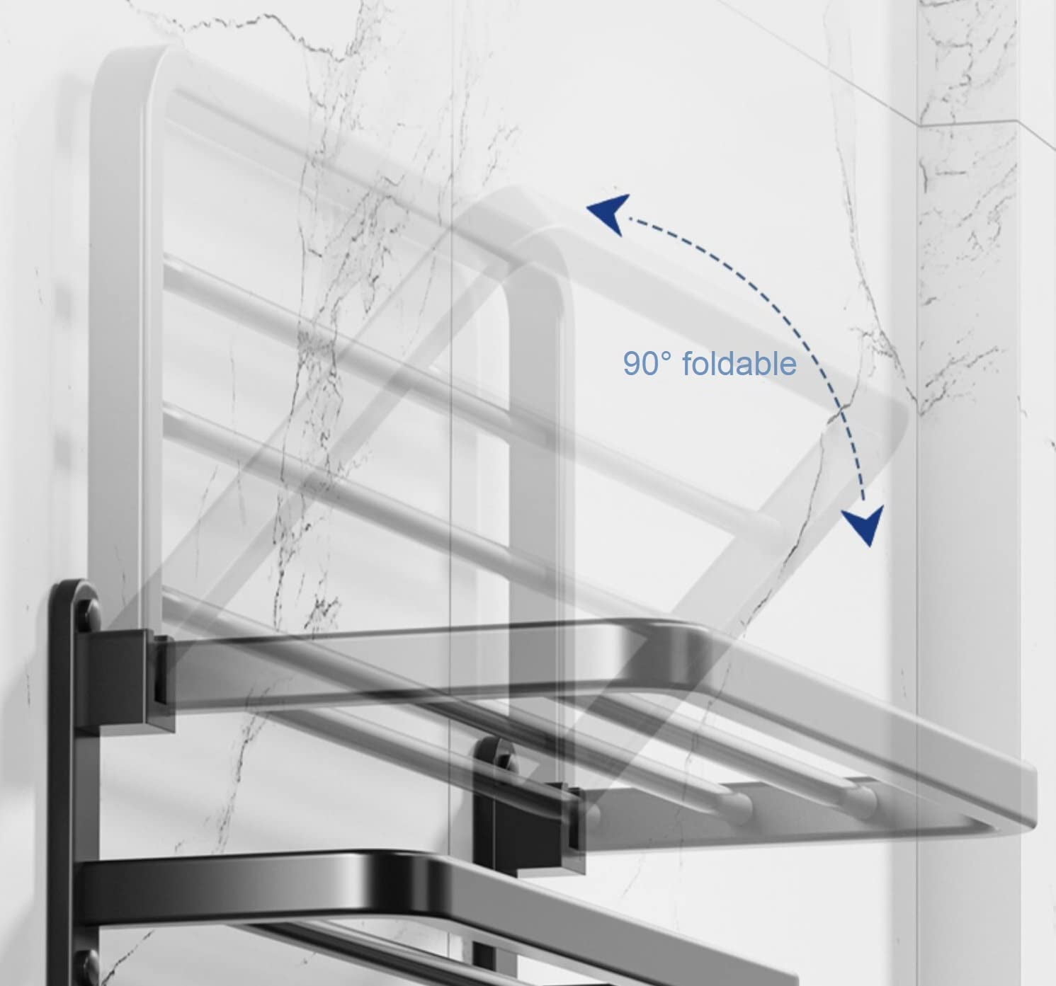 FLEXIBLE DESIGN: 90° foldable towel rack with 2 towel rails and 2 hooks, you can put bath towels, bath balls and other bathroom items, more efficient and convenient use of your space.