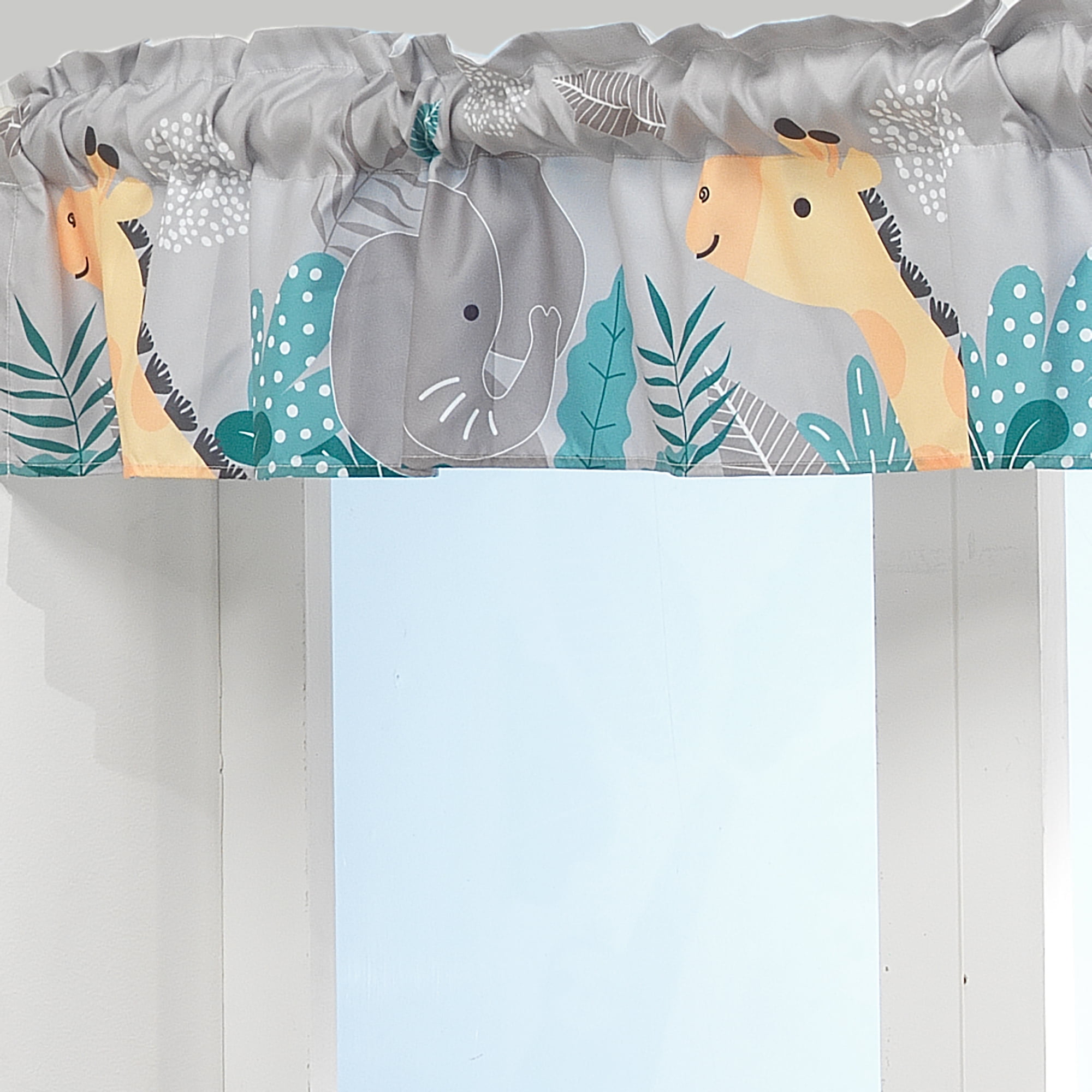 Add a splash of color to your baby’s room with this coordinating microfiber window valance. It features our friendly elephant and his best pal Stretch the giraffe. It is 54” in length and is 9” high and has a two-and-a-half-inch wide rod pocket for easy hanging. Rod sold separately. Coordinates with our Mighty Jungle bedding collection. Machine washable for easy care.