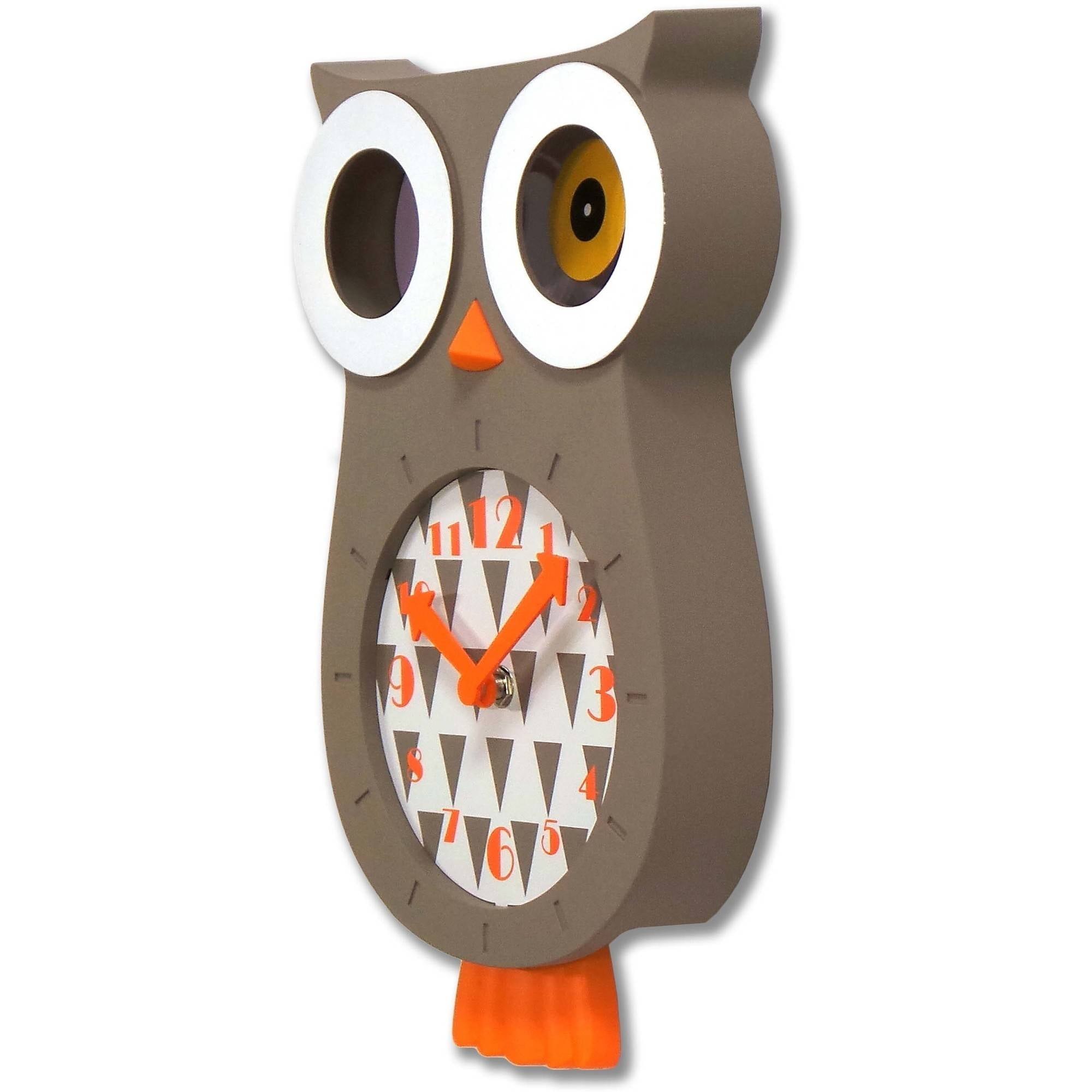 Functionality meets fun with this Better Homes and Gardens Owl Pendulum Clock decorated in contrasting colors. For a whimsical flair, the tail and eyes move side to side as the clock runs. The numbers on the face as well as the hour hands are bright and bold. Versatile by design, this adorable wall accessory is ideal for a child’s bedroom, a nursery or even the kitchen. It also makes a super cute addition to a creative workspace in your home. Power up this plastic pendulum clock with two AA batteries.