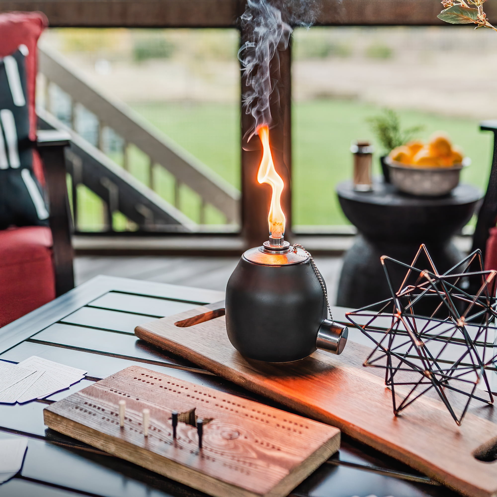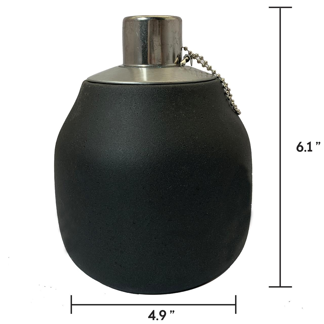 Add a simple, modern statement piece to your patio décor with the Better Homes & Gardens Madden Black Outdoor Tabletop Tiki Torch. Made of ceramic with a matte black finish, this tabletop tiki torch has a soft rounded shape with subtle texter that will look beautiful on your porch or deck and is durable enough for use outside. The removable stainless steel fuel canister features a wide mouth for easy filling with any outdoor tiki torch fuel. The fiberglass wick creates a torchlight glow for natural patio lights and provides a long-lasting burn. Place this tabletop tiki torch at the center of your patio dining table to make a statement, or on side tables around your lawn and garden to add a little extra glow. Use the included snuffer cap to extinguish the tiki torch and protect the wick between uses and drain remaining fuel into the original bottle before storing. These sleek tabletop tiki torches will add the finishing touch to your next outdoor event, or brighten your yard all summer long. For best results, place several outdoor tabletop tiki torches around your garden, deck, or patio to create a perimeter against mosquitoes around the area where people will gather.