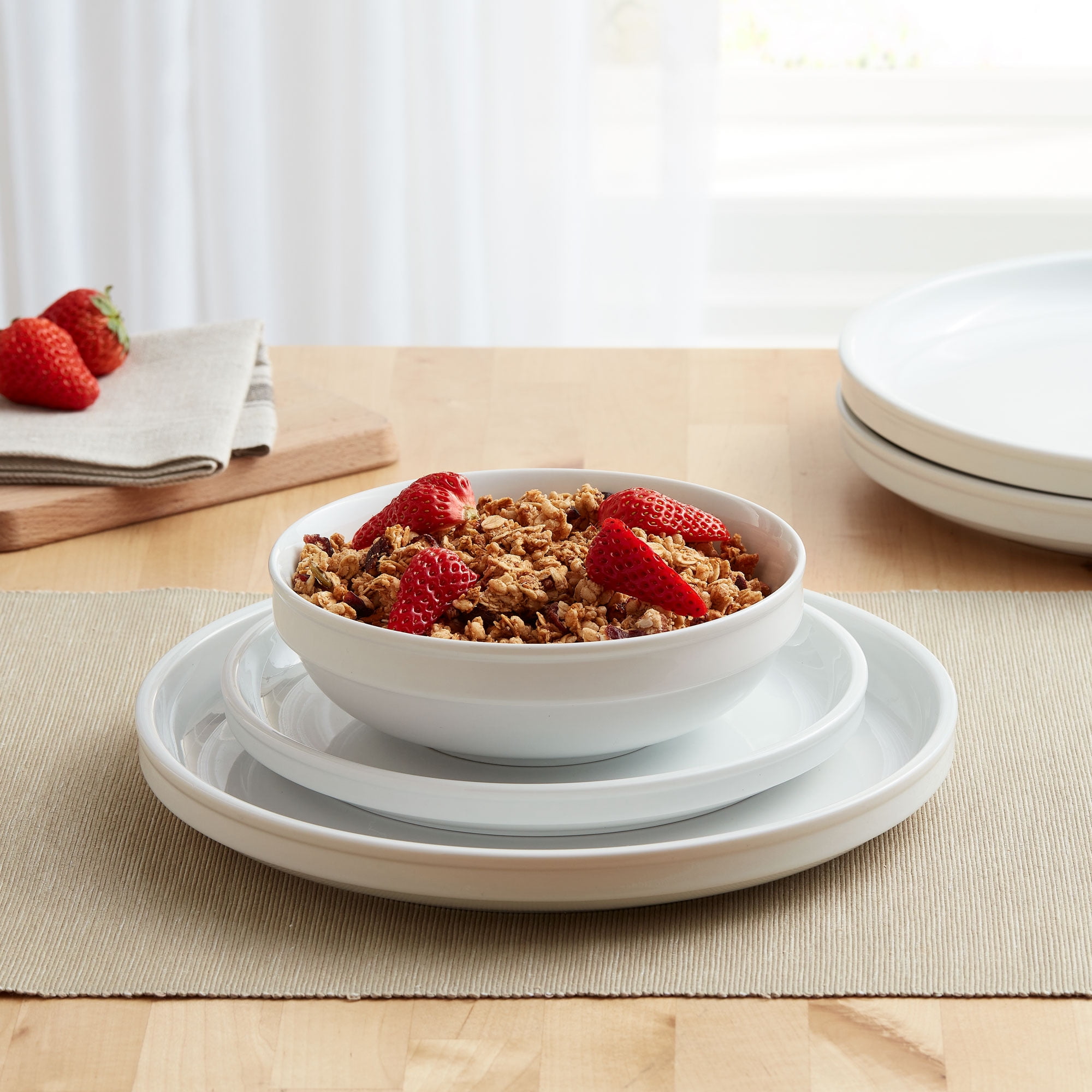 Bring everyone around a chic-looking table with the Better Homes & Gardens Seger 12-Piece Dinnerware Set. This contemporary dinnerware set includes dinner plates, salad plates, and bowls, all of which can stack together in one coordinated place set. Crisp white porcelain makes this set especially versatile across dining rooms of all decor types. The Better Homes & Gardens Seger 12-Piece Dinnerware Set can be used on a daily entirely dishwasher and microwave safe, making it perfect for a set for a busy home.