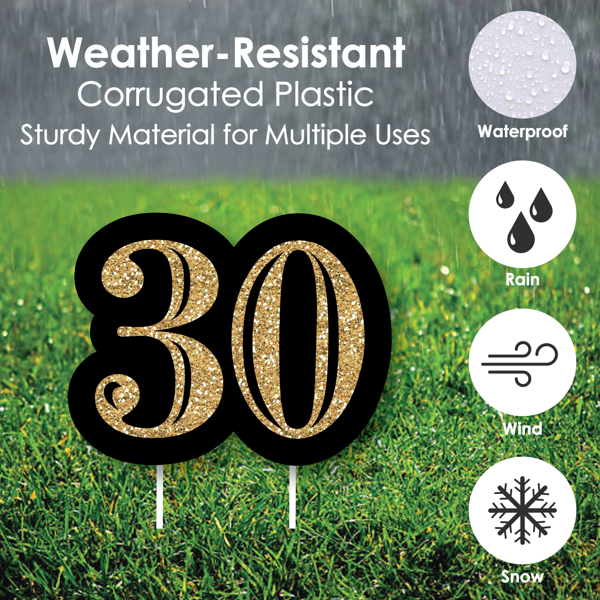 - MADE IN THE USA: Adult 30th Birthday – Gold – Yard Sign & Outdoor Lawn Decorations are designed and manufactured at our Wisconsin facility using materials that are Made in the USA. 30th Birthday Signs use a No-Mess Glitter Print: Our yard decorations are designed with a printed image of glitter, eliminating glitter flake while maximizing bling effect!