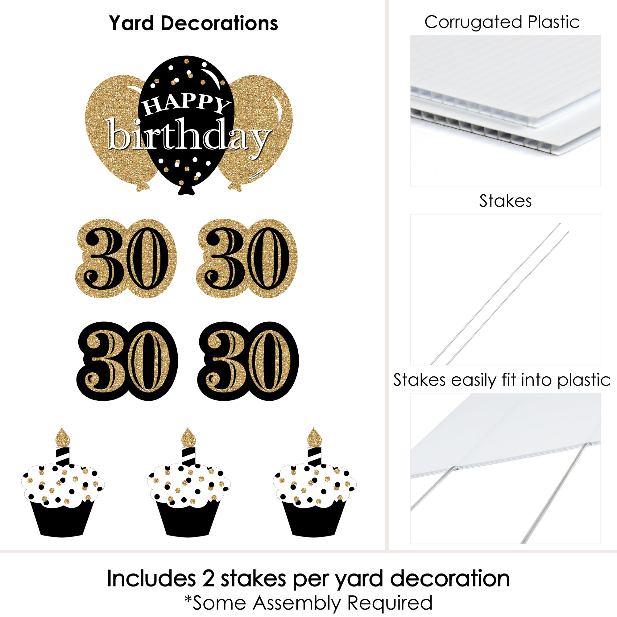 - Cupcake and 30 Lawn Decorations INCLUDES 8 coordinating Adult 30th Birthday – Gold yard decorations: 1 Large Happy Birthday, 3 Cupcake Shapes, 4 – 30 Shapes; and 16 stakes for displaying. Easy assembly instructions are also included.