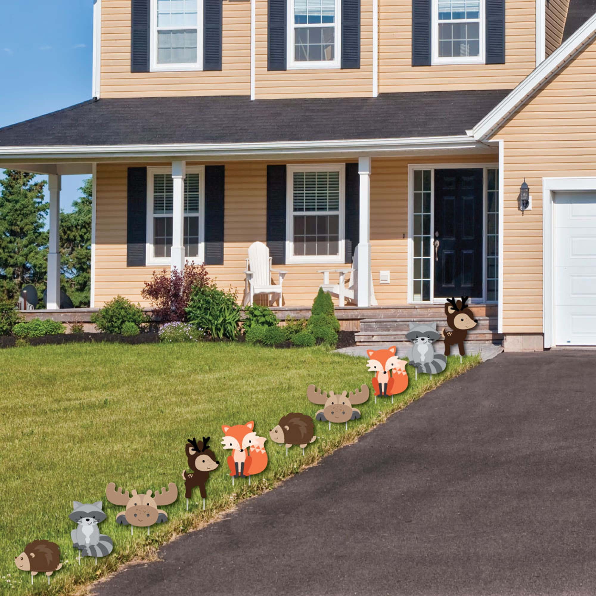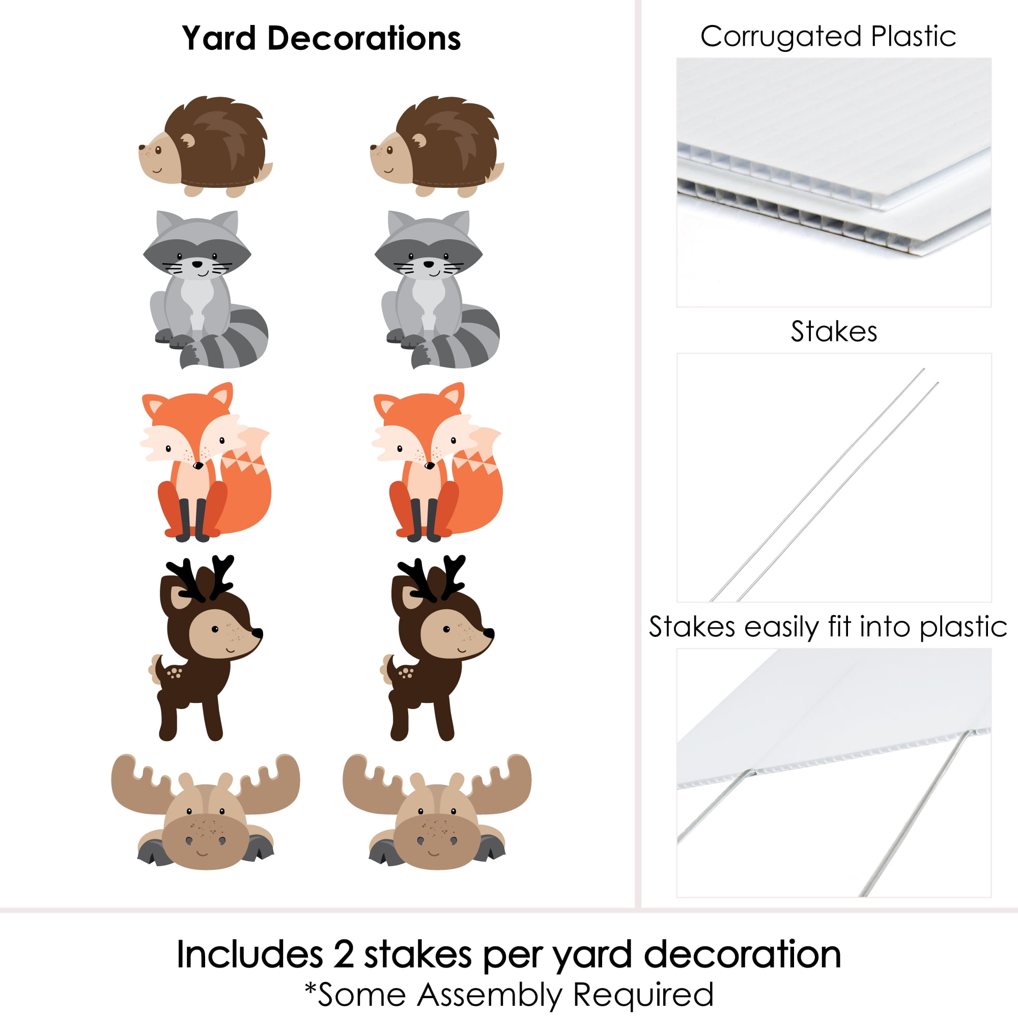 - Outdoor Baby Shower or Birthday Party Lawn Decorations INCLUDES 10 coordinating Woodland Creatures yard decorations: 2 Hedgehog, 2 Moose, 2 Fox, 2 Deer, 2 Raccoon; and 20 sturdy stakes for displaying.