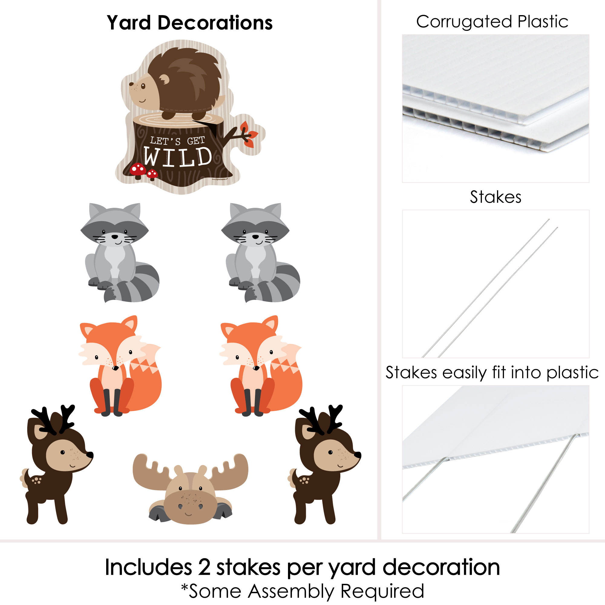 - Forest Friends Lawn Decorations INCLUDES 8 coordinating Woodland Creatures yard decorations: 1 Large "Let’s Get Wild" Sign, 1 Moose, 2 Raccoons, 2 Fox, 2 Deer, and 16 stakes for displaying. Easy assembly instructions are also included.