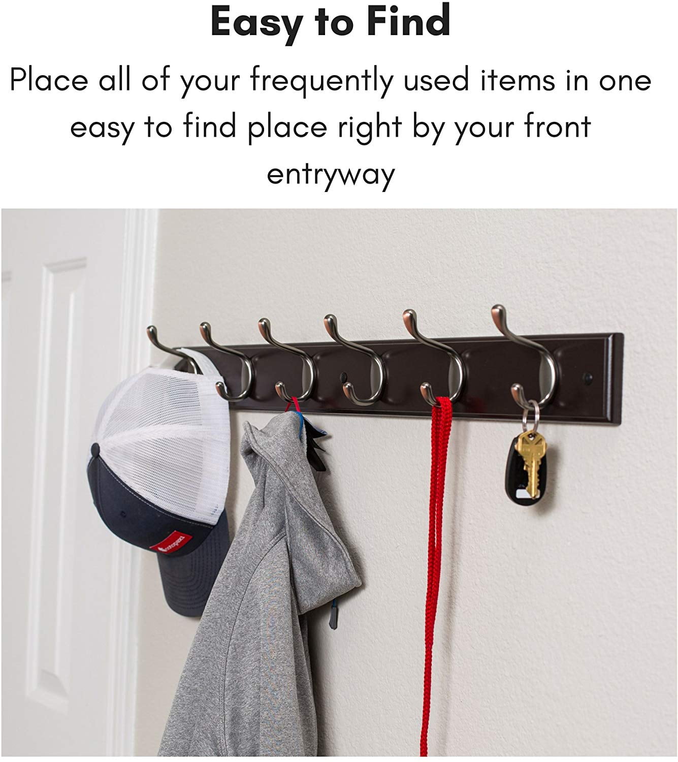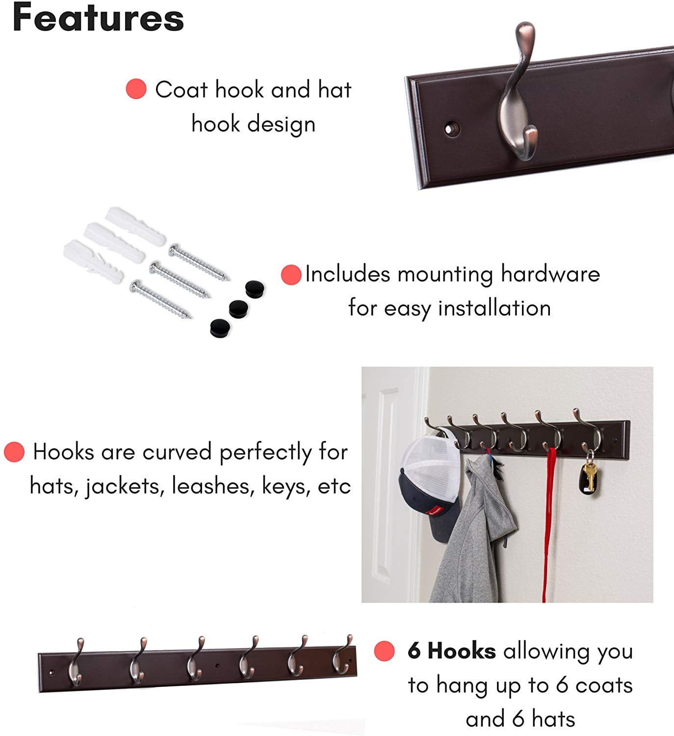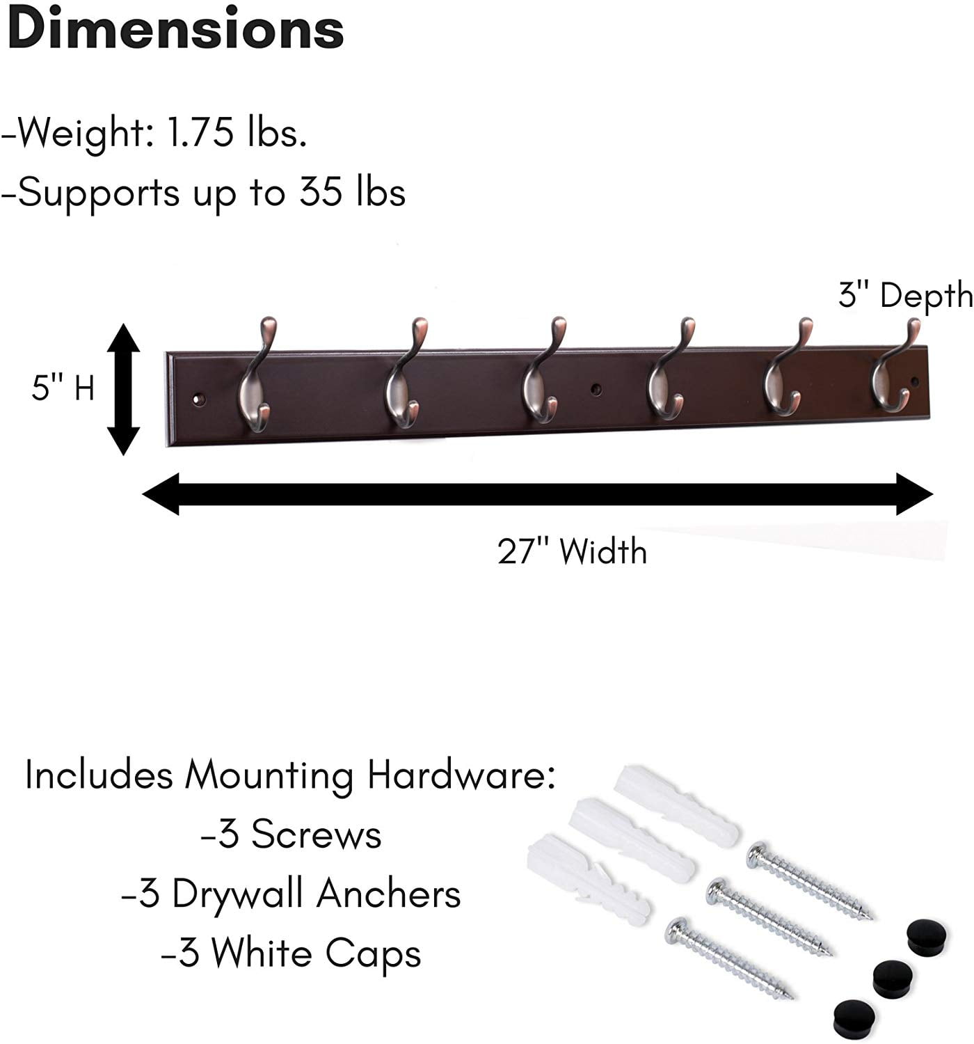 This BirdRock Home Hook Rail features oil rubbed bronze hooks and a classic design. Great for use in bedrooms, closets, bathrooms, hallways or foyers. Fits in with any decor. Use for hanging hats, coats, scarves, towels, bags and more. Hardware is included. Available in 2 sizes and 3 finishes.