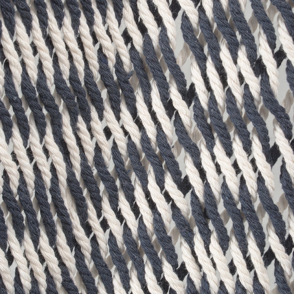 The Bliss Weekender™ Brazilian Rope Hammock is made of 3mm natural and blue colored cotton rope, that is hand woven to create a multi-colored design while giving you that traditional feel. The bed is made entirely of hand crafted, precisely twisted cotton rope that creates a tight, strong, well balanced comfortable surface. This Brazilian style rope hammock is the most comfortable gathered-end hammock, made to provide more support & comfort in commonly strained areas like the head, knees, and ankles. It is the perfect addition to your backyard, or indoors. Two eye screws and hooks are included for easy hanging, or use with a 10ft stand (sold separately). Bed size is 34” W x 74” L and can stretch to a width up to 55” so it can be enjoyed with your legs stretched out for a wide range of comfort! . The weight capacity is 350 lbs and like all Bliss Hammocks, comes with a one year warranty… Find Your Bliss!