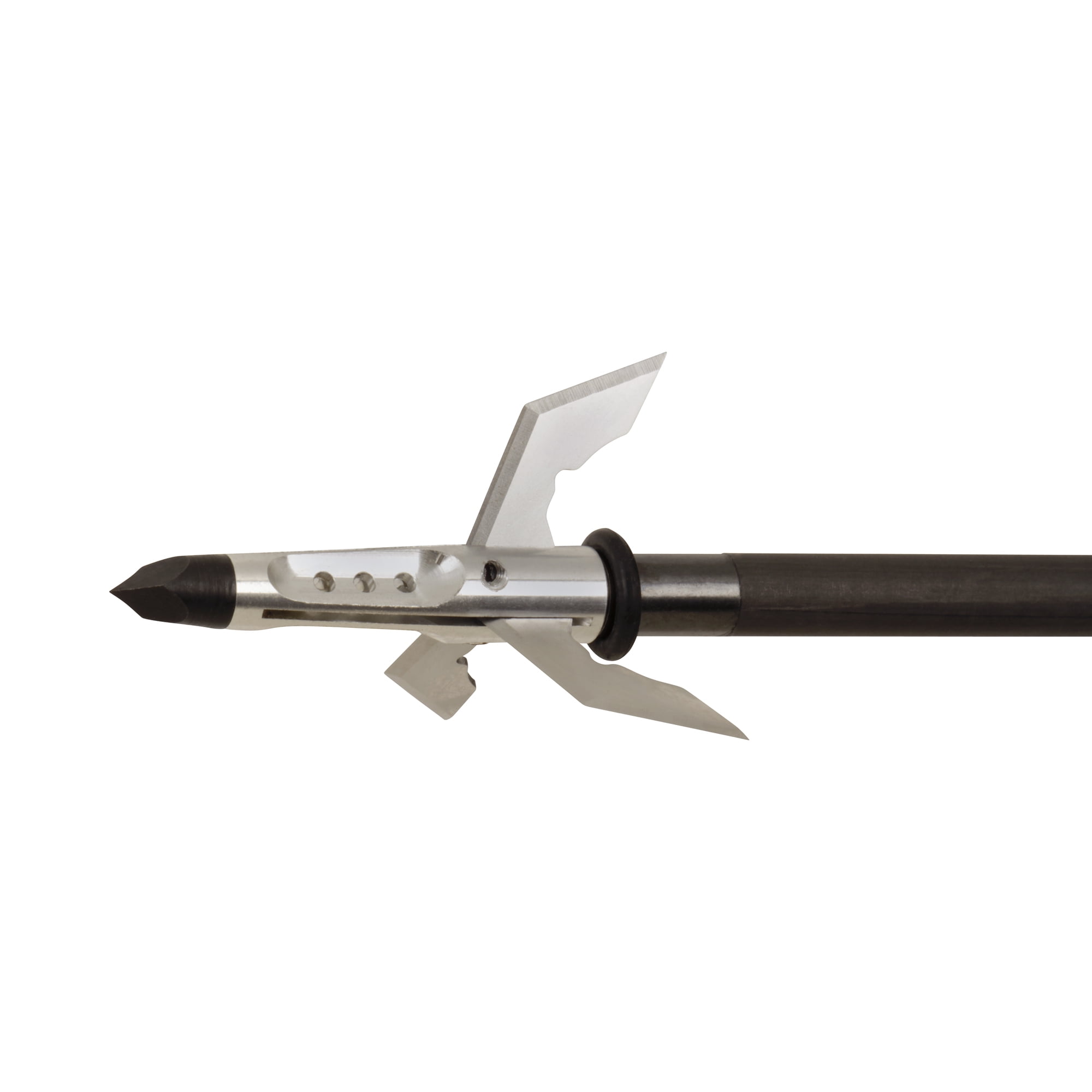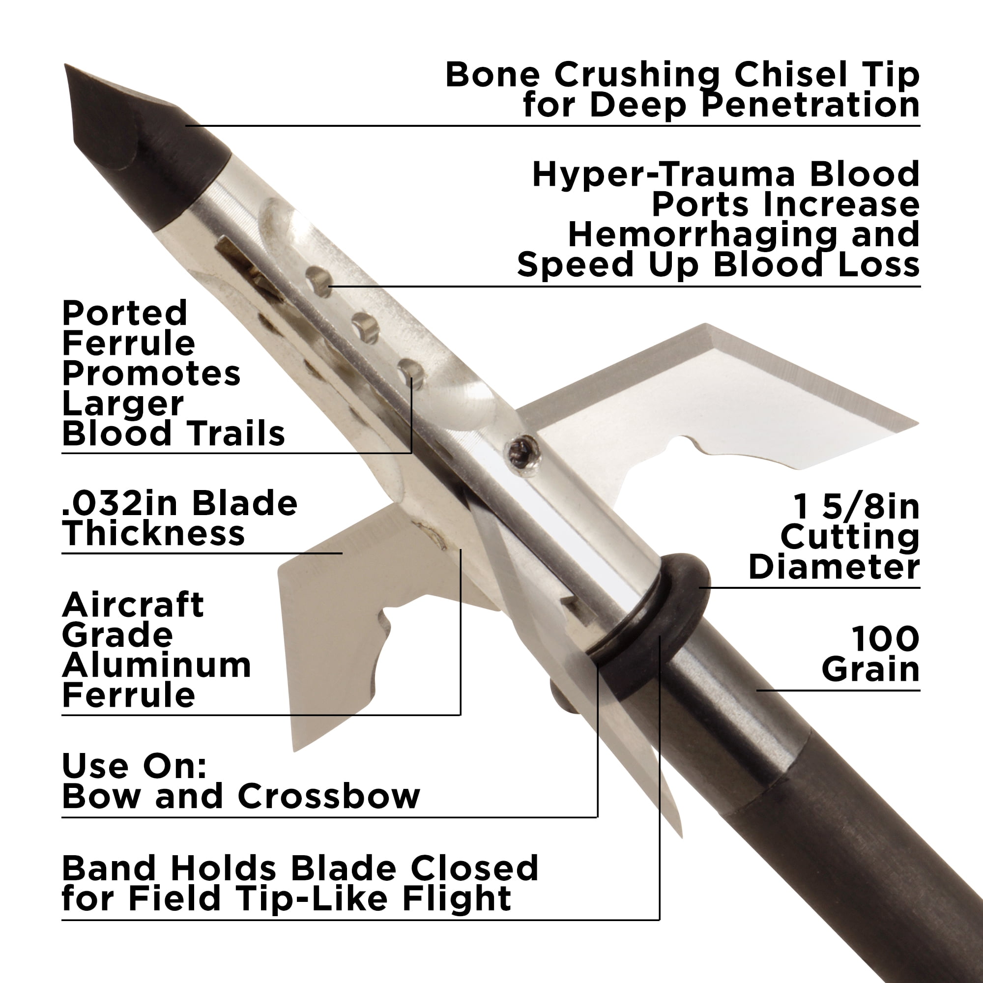 Bloodrush provides an archery broadhead design with the premise of soft tissue laceration and the acceleration of blood loss, when compared to conventional broadheads. Built with physical characteristics to promote faster hemorrhaging, through ferrule ‘blood ports’ and a 26-degree twisted ferrule design, these crossbow broadheads create a devastating cutting diameter of 1.375”. The Bloodrush Expandable 3-Blade Hybrid Hunting Crossbow Broadheads are made with an aircraft-grade aluminum ferrule while the twisted design multiples soft tissue displacement. The broadheads blood ports not only accelerate blood loss but enhance how blood fluid is displaced across a larger surface area. This design combination of the ferrule twist and blood ports creates a deadly whirlpool or fluid vortex, making blood trails easy to find.