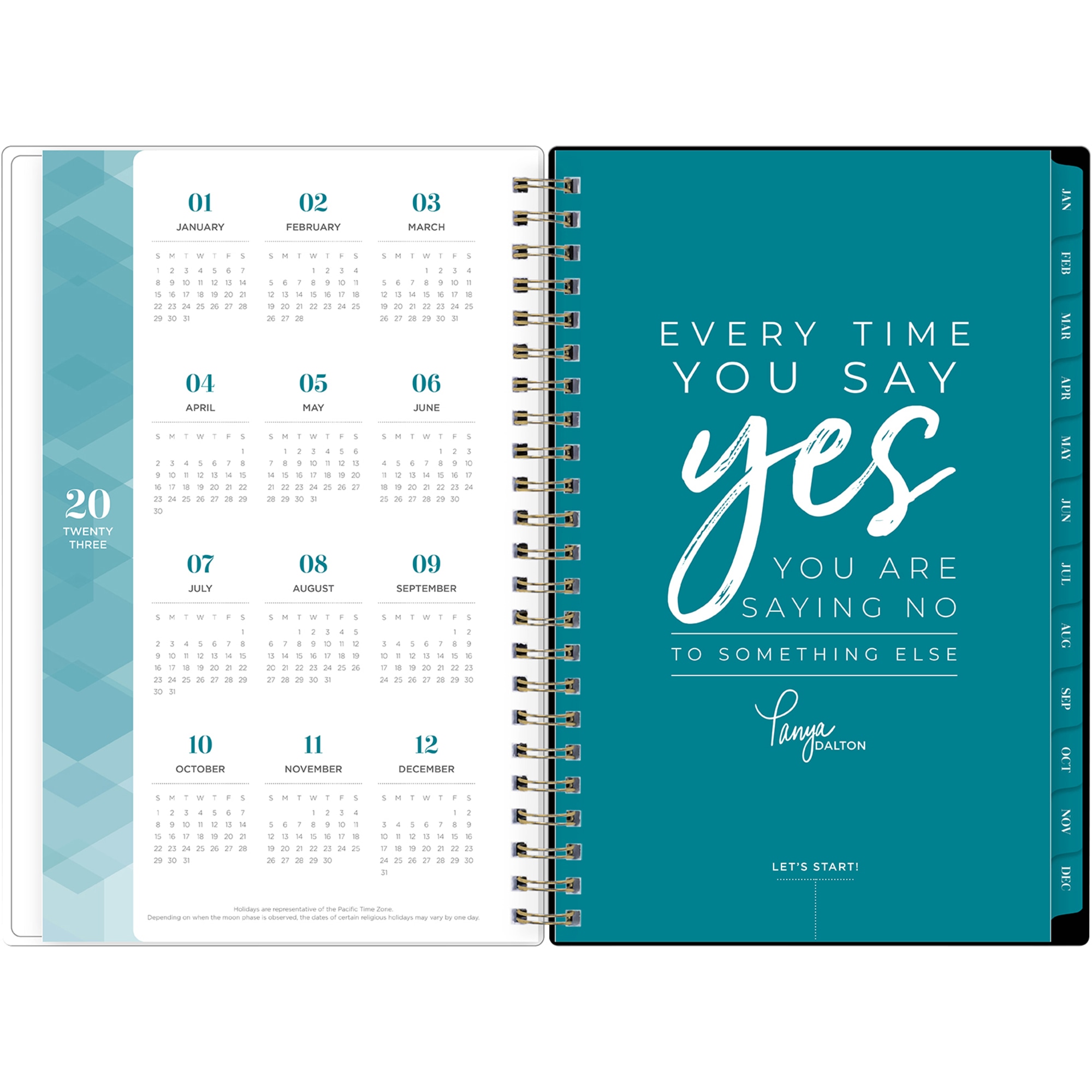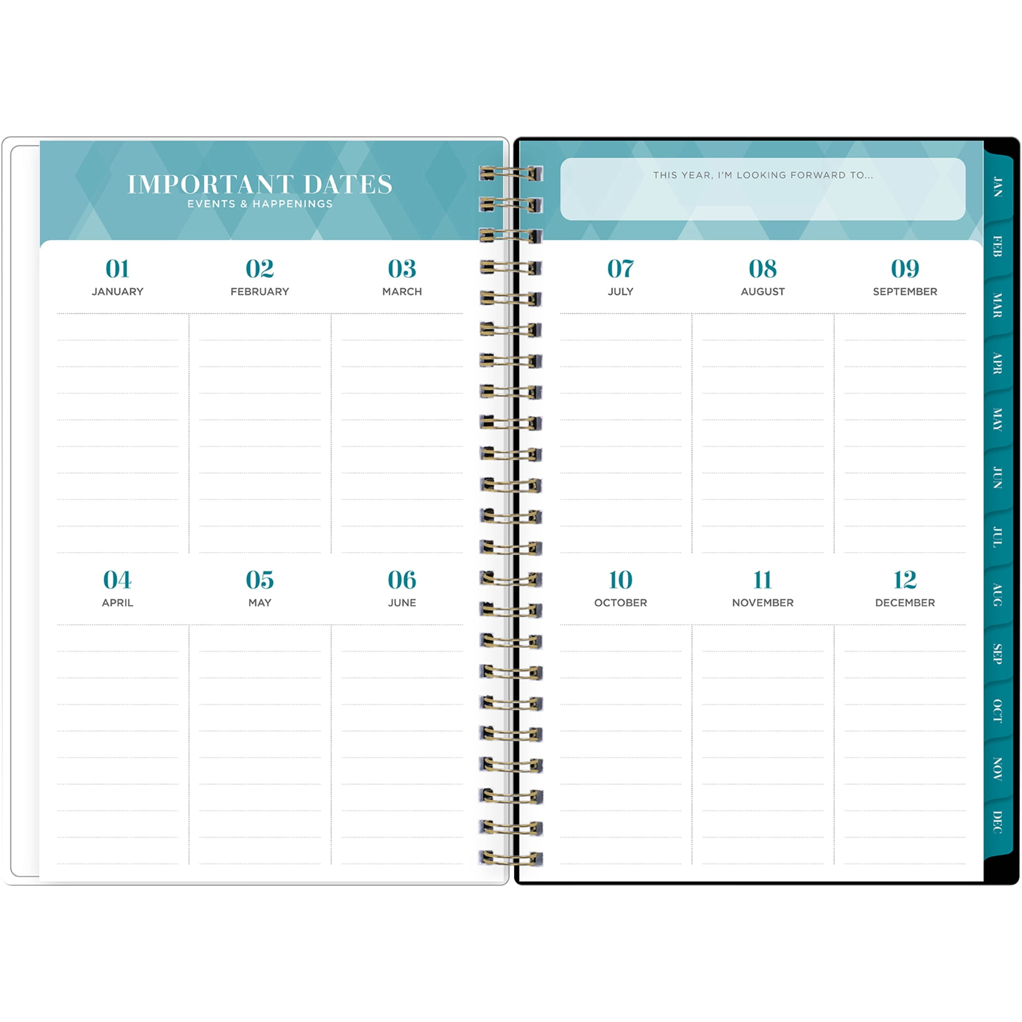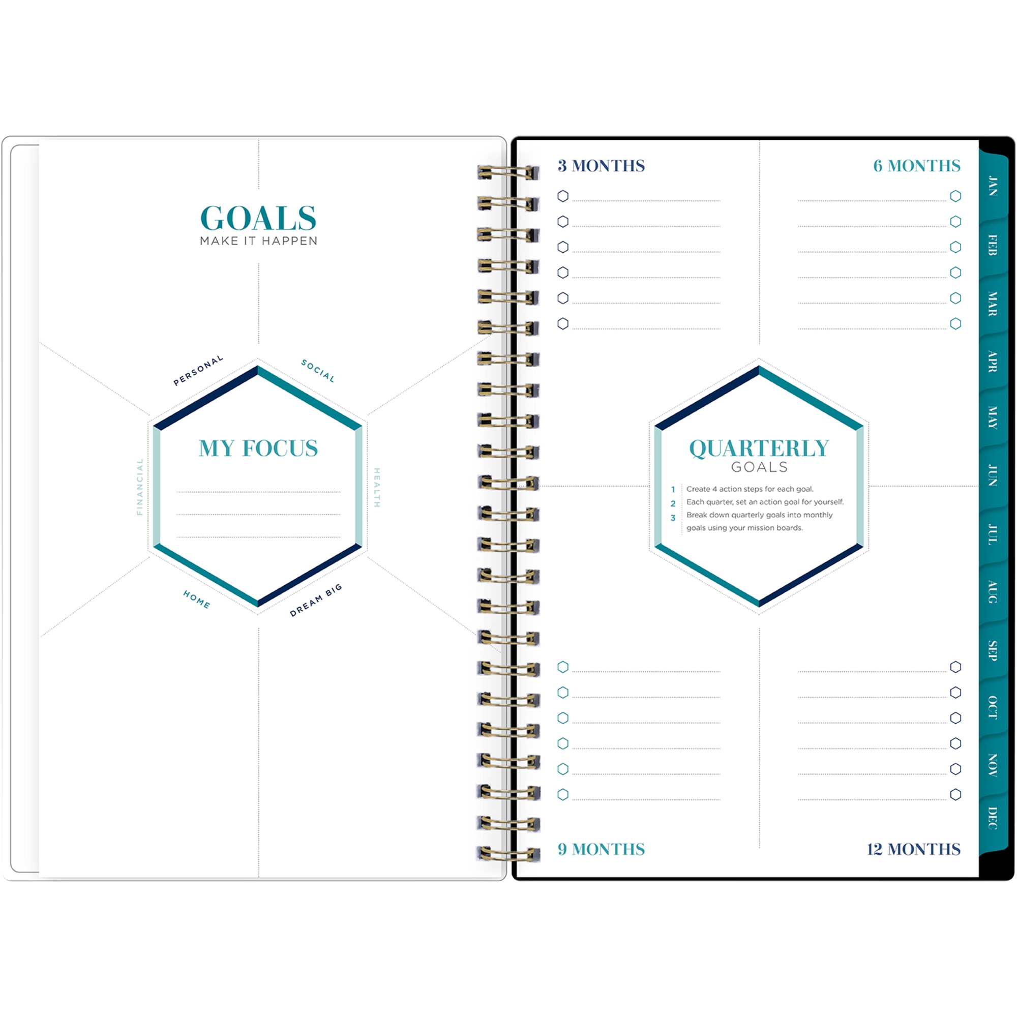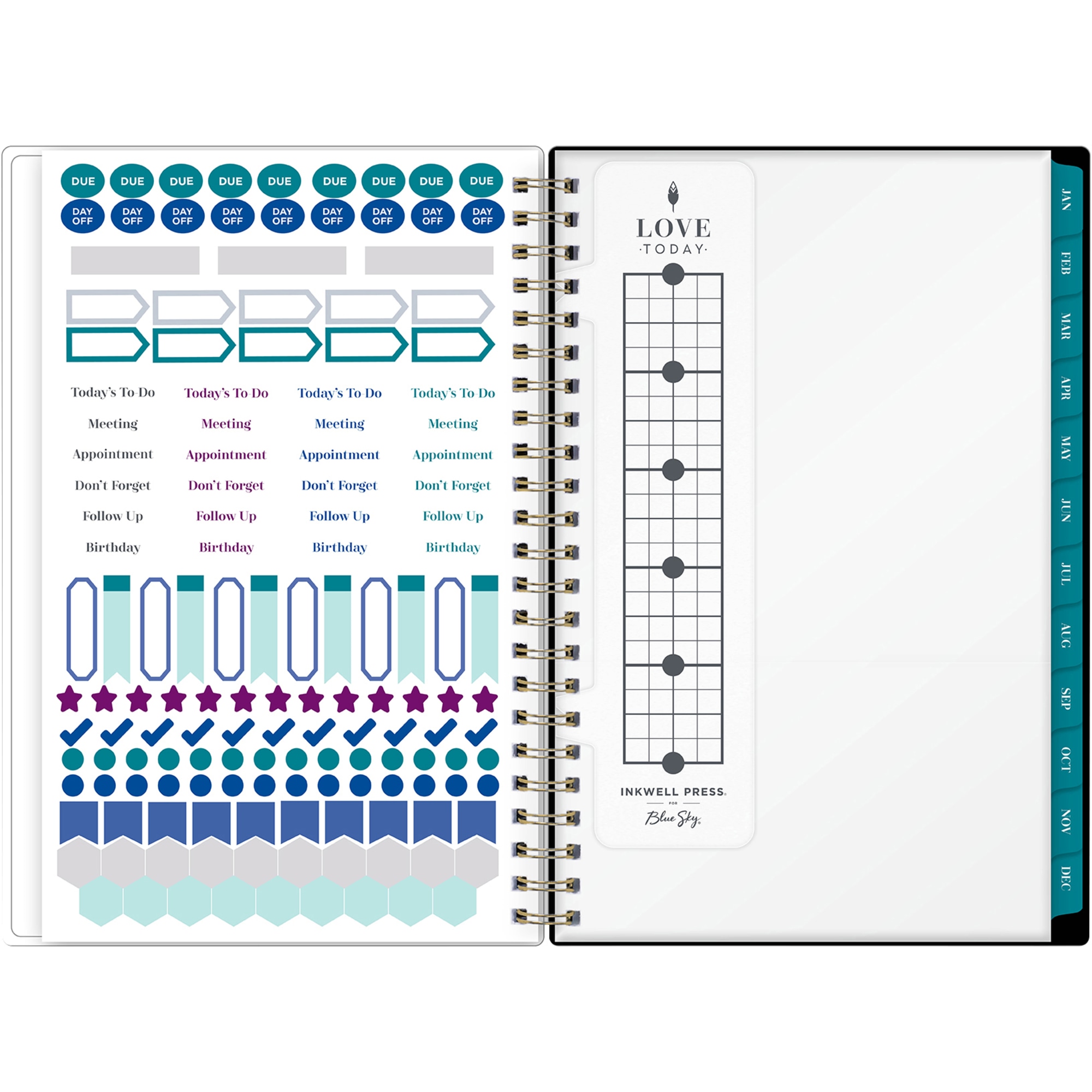 Achieve your goals with help from the Blue Sky inkWELL Press Weekly/Monthly Planning Calendar. Weekly and monthly spreads help you plan short and long term. Boasts 2 pages per week and 2 pages per month. Dedicated sections for goal setting, quarterly goals and mission board worksheets. 12 months: January to December. Clear cover pocket can hold artwork and photos. Interior storage pocket holds loose sheets. Tab dividers help you quickly flip to the current month. Includes a snap-in ruler and 2 sheets of stickers. Pages are securely wire-bound within the flexible cover.