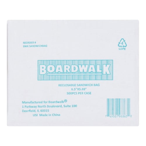 Keep food safe with sturdy, secure, Boardwalk food storage bags. Ziplock seals tightly, yet it is easy to open. Highly visible, white, writeable label for date and content allows easy identification for freezing and storage. Distinct dispenser box helps you maintain a clean and organized workspace and quickly grab a bag while doing food prep and clean-up. Food Storage. Application: Food Storage; Capacity Range (Volume) [Max]: Sandwich; Thickness: 1.15 mil; Material(s): Linear Low-Density Polyethylene. Compliance Standards: FDA Compliant. Post-Consumer Recycled Content Percent: 0%. Pre-Consumer Recycled Content Percent: 0%.