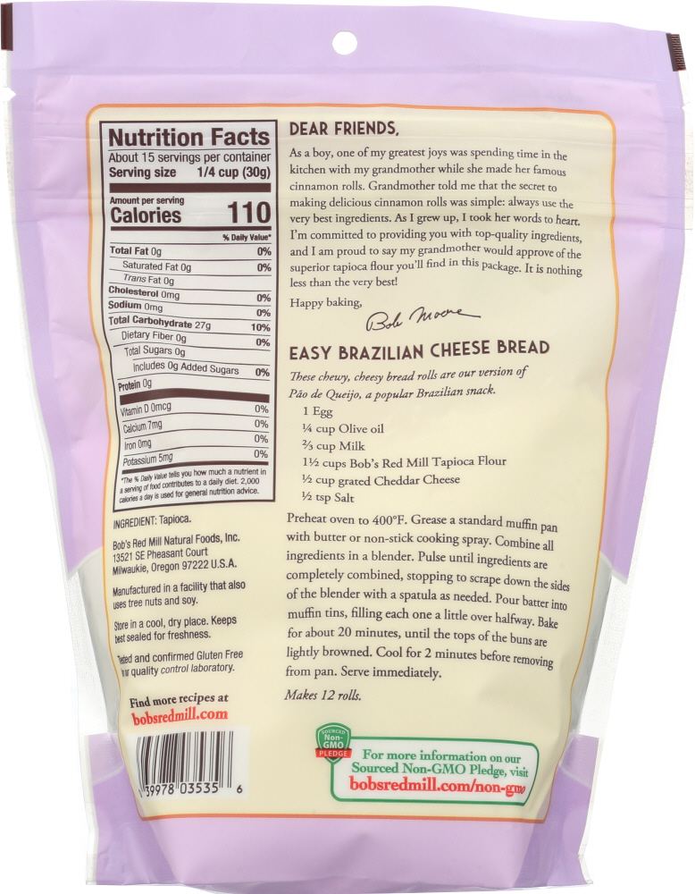 Bob’s Red Mill Tapioca Flour, also known as Tapioca Starch, is ground to a powdery fine granulation from the dried roots of the cassava plant. It is gluten free and grain free. Tapioca Flour is great for thickening soups, sauces and fillings and is perfect for baking.