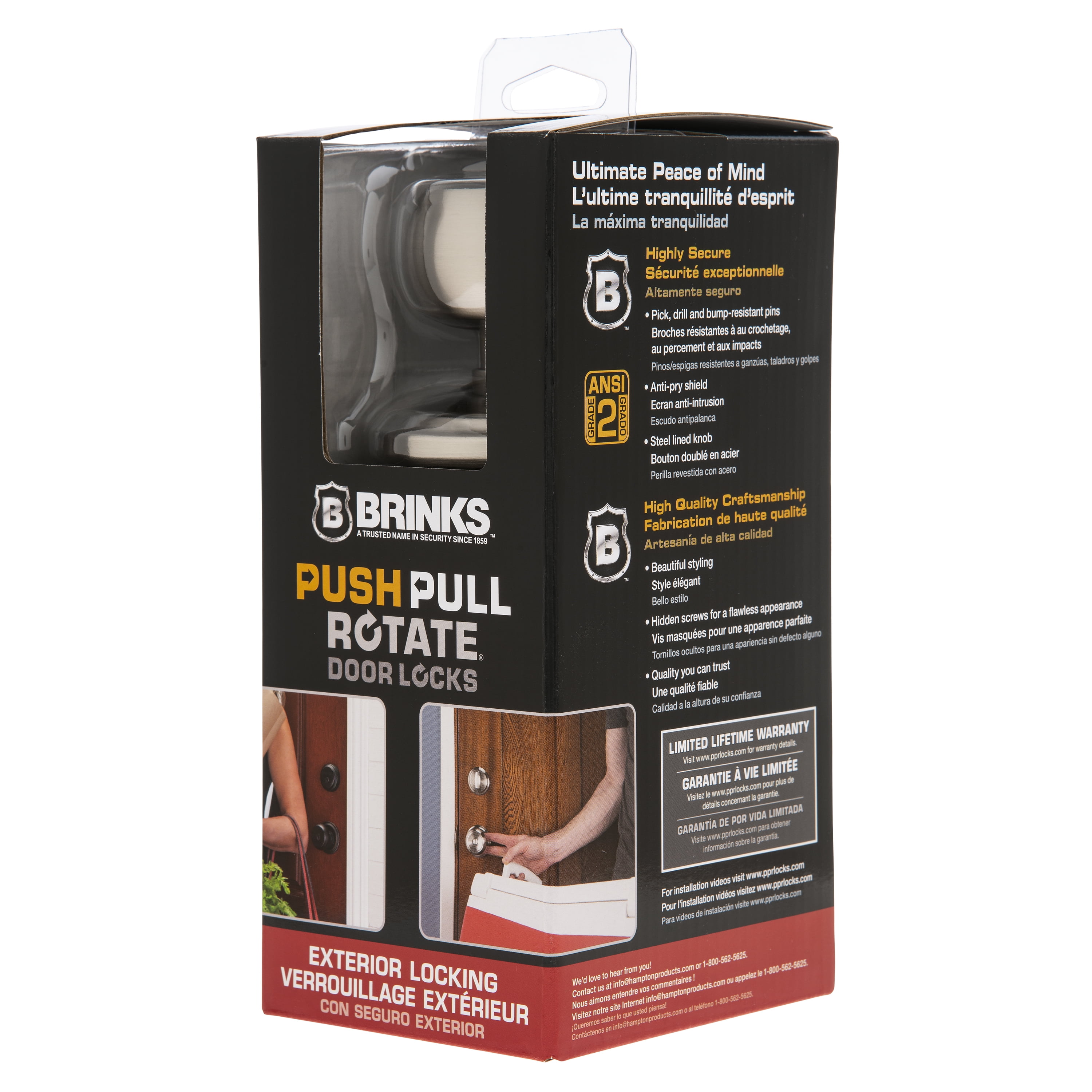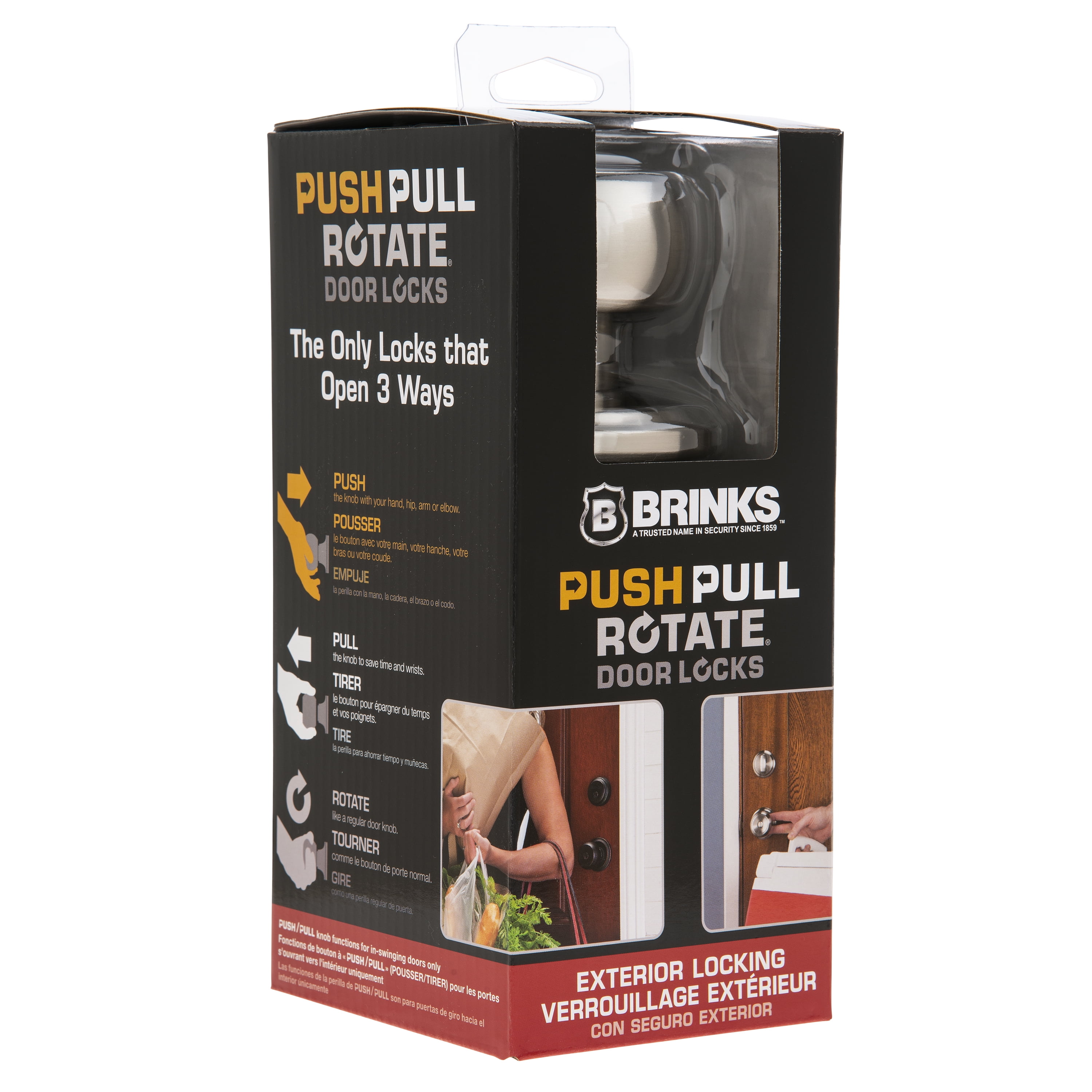 Push Pull Rotate™ the hands-full door lock from Brink’s. The only door lock that opens 3 ways. Push it, pull it, or rotate it. With an elbow, hip or finger you can open the door by simply pushing or pulling on the knob or lever. Despite being so easy to use, these locks are built to achieve the most rigorous residential security standards as you would expect from Brink’s. You can rest assured they will keep intruders out and your family and valuables safe. Push Pull Rotate door locks are built on a commercial grade chassis to withstand repeated use and abuse making them perfect for front and back doors and for all interior rooms like bathrooms, laundry rooms, and pantries. Installation is easy and they fit all standard doors. You only need a Phillips screwdriver and a few minutes to dramatically improve the function and appearance of your home.