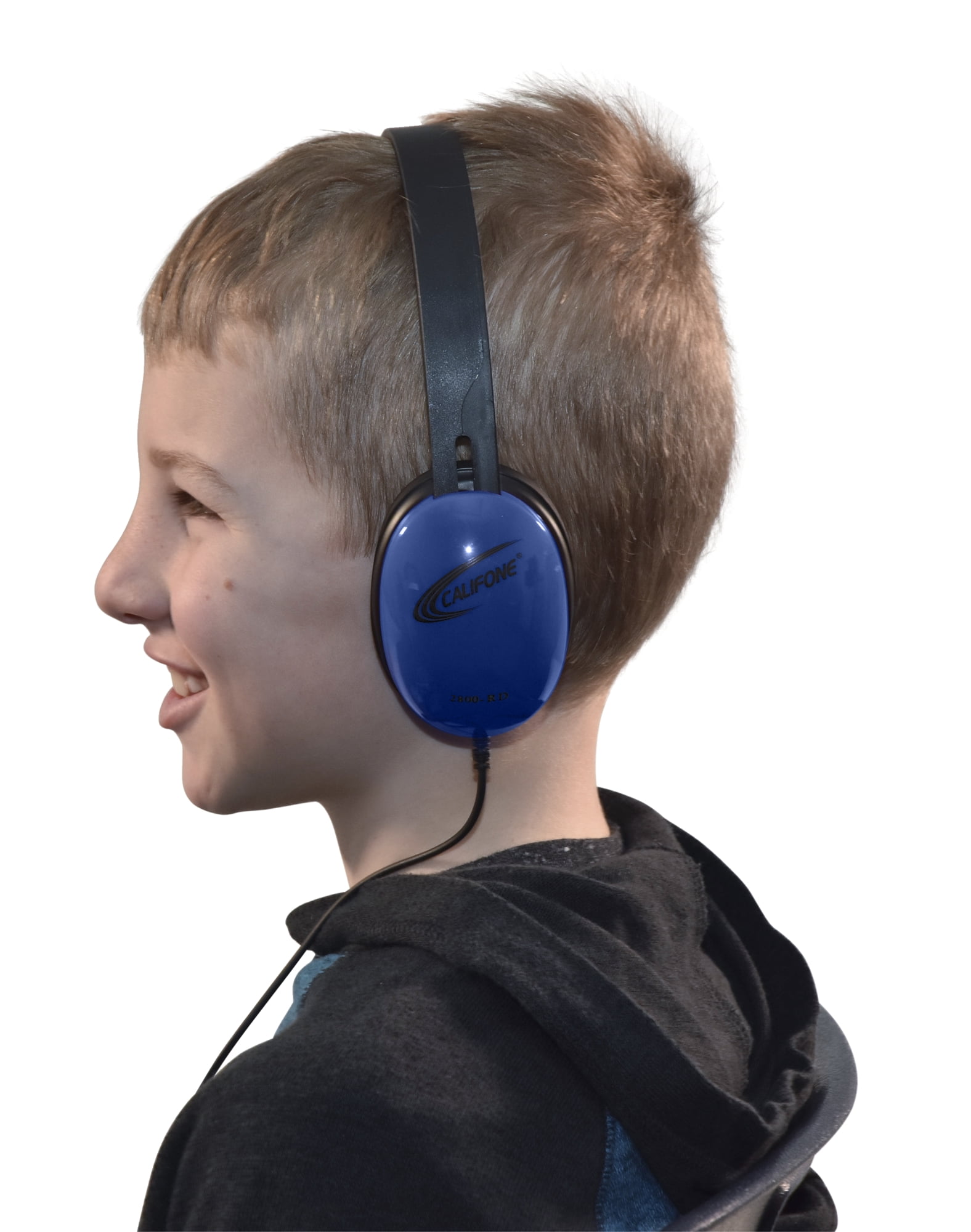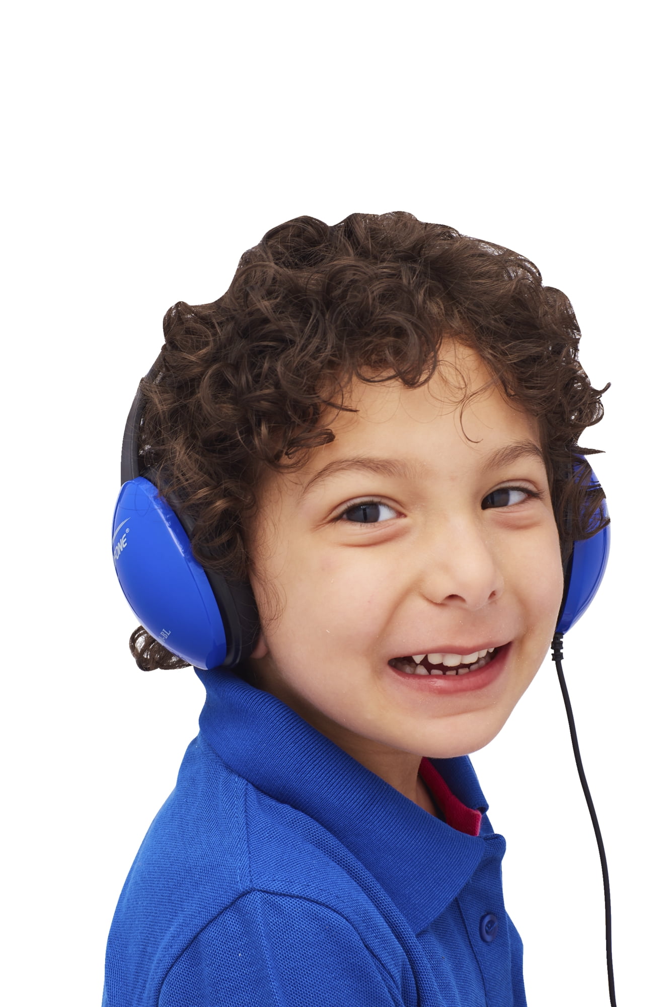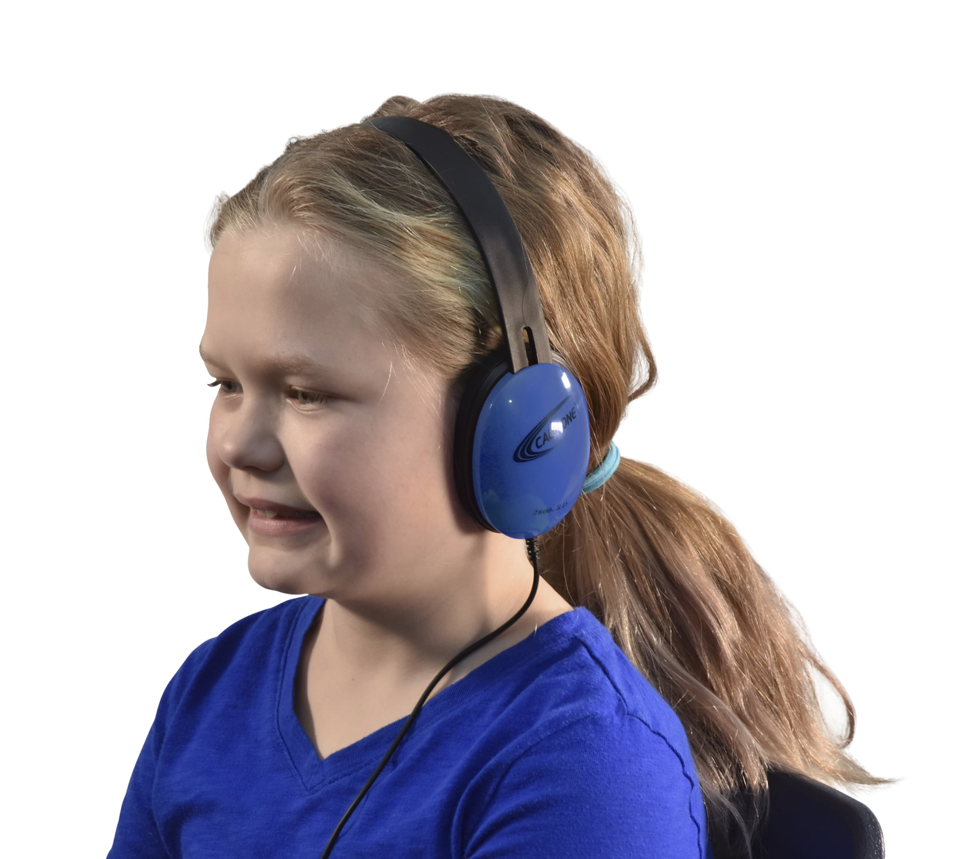 Stereo headphones are specifically built for young students with safety as their first concern. Adjustable headband provides a comfortable fit for extended wear. A permanently attached cord with a reinforced "strain" connection prevents it from detaching for lasting use. Right-angle plug resists accidental pullout. Noise-reducing earcup lowers ambient noise so the volume does not need to be played at high levels. Rugged, ABS plastic earcups resist breakage in high-use situations. Leatherette ear cushions are replaceable to maintain sanitary use. Volume control is set from the audio source for student safety. Headphones are perfect for classroom Storytime, library and computer use.