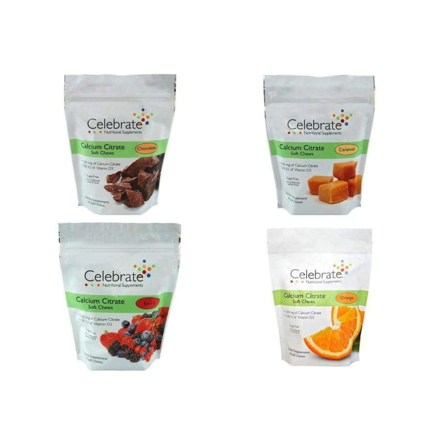 Celebrate Calcium Soft Chews have been completely reformulated! Available in 8 AMAZING flavors that include Watermelon Cherry Strawberry-Banana Caf Mocha Chocolate Caramel Orange and Blackberry! All oftheir flavors featuretheir NEW Ultra-smooth texture formulation that has absolutely ZERO calcium grit! In addition to tasting great these calcium chews pack a whopping 500 mg of Calcium (as calsium citrate) in each chew! This is the MOST calcium found in a soft chew.Here are some key elements to Celebrates soft chews that make them different from other soft chews on the market:500 mg of calcium citrate.500 IU of vitamin D3.Do not stick to teeth.Soft and easy to chewGreat taste!Celebrate soft chews also come in a resealable bag for freshness!Key Things to Look for in Celebrates Calcium Citrate Soft Chews:Taste & Texture – If you are choosing a soft chew product then these aspects are very important to you. Celebrates Calcium Citrate Soft Chews will not only provide you with the best bone health formulation available in a bariatric product but it will also deliver it in a product that you will love! Celebrates Calcium Citrate Soft Chews will NOT stick to your teeth and are easy to chew unlike many other products on the market.Calcium Citrate – Supplemental calcium is critical for every patient undergoing surgical weight loss to ensure bone health and the number one recommended form is calcium citrate. Each Calcium Citrate Soft Chew has a whopping 500 mg of calcium citrate in each chewable. Dosages greater than 500 mg per serving will not be properly absorbed.Vitamin D3 (cholecalciferol) – The primary purpose of vitamin D is to aid in the absorption of calcium. With 500 IU in each Calcium Citrate Soft Chew plus an additional 3000 IU found in Celebrates Multivitamin (and Celebrates Multivitamin Soft Chew or Multi-Complete) Celebrate delivers the highest level of vitamin D available in a bariatric protocol. Since Celebrate products are developed by medical professionals you can be sure that these are still within levels safe for a bariatric patient.Water-Miscible Vitamins ADEK – We utilize a dry water-miscible form of vitamin D to further enhance absorption. This means that this product does not have to be taken with fat to optimize absorption unlike the vitamin D included in many other calcium brands.Resealable Bag -Celebrates Calcium Citrate Soft Chews come in a resealable bag ensuring long-lasting freshness!Also available in Variety Packs:4-Flavor Variety Pack includes:1 x Chocolate1 x Caramel1 x BlackBerry1 x Orange8-Flavor Variety Pack includes one bag for every flavor:WatermelonStrawberry Banana CreamCherryCafe MochaChocolateCaramelBlackBerryOrangeBerry:Chocolate:Caramel:Orange:Watermelon :Strawberry Banana :Cherry:Cafe Mocha: