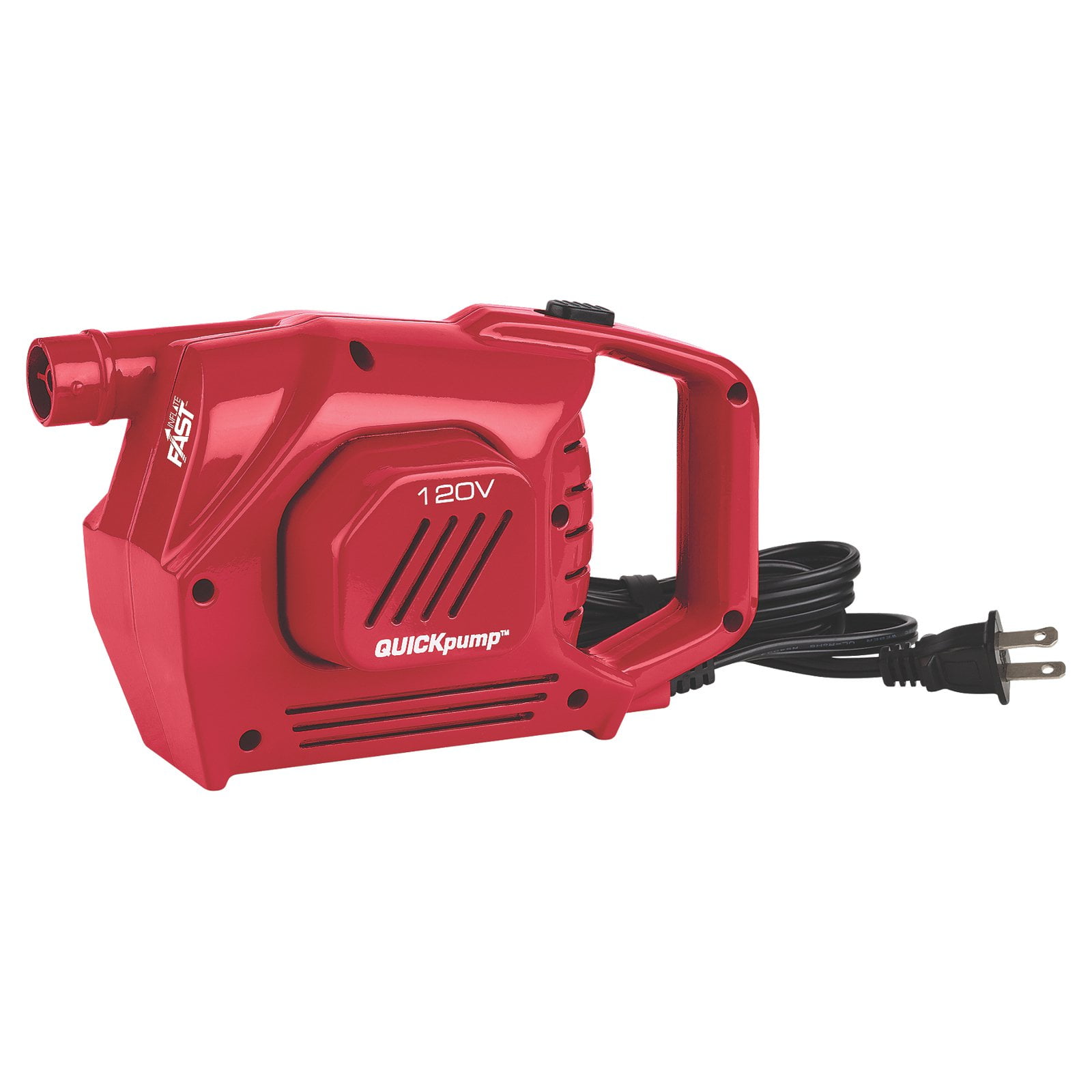 The Coleman 120V electric air pump quickly inflates or deflate virtually any airbed. Just plug in the 120V pump to your home outlet and watch this powerful pump inflate a queen double high airbed in just two minutes. Added adaptors allow you to use the pump on any Coleman Double Lock Valve, Boston valve or smaller pinch valve. When the fun is done, the pump also deflates your airbed or inflatable for quicker storage. Features: Inflates air into bed in a matter of seconds. Deflates air out of bed in a matter of seconds. Plugs into electrical outlet. Features two nozzles inflation and deflation. Easy on and off switch. Pick up the unit with the structured handle.