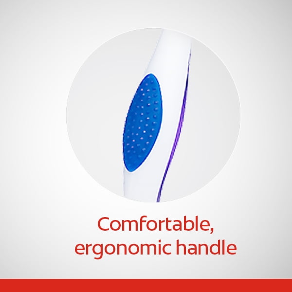 The Colgate 360 Medium Toothbrush with Tongue and Cheek Cleaner features an adult, compact head toothbrush that’s designed with medium cleaning bristles and polishing cups that help remove more plaque and stains than an ordinary flat-trim toothbrush. This manual toothbrush has an ergonomic handle design and a unique cheek and tongue cleaner that helps reduce 151% more bacteria that cause bad breath versus brushing teeth with an ordinary flat-trim toothbrush.