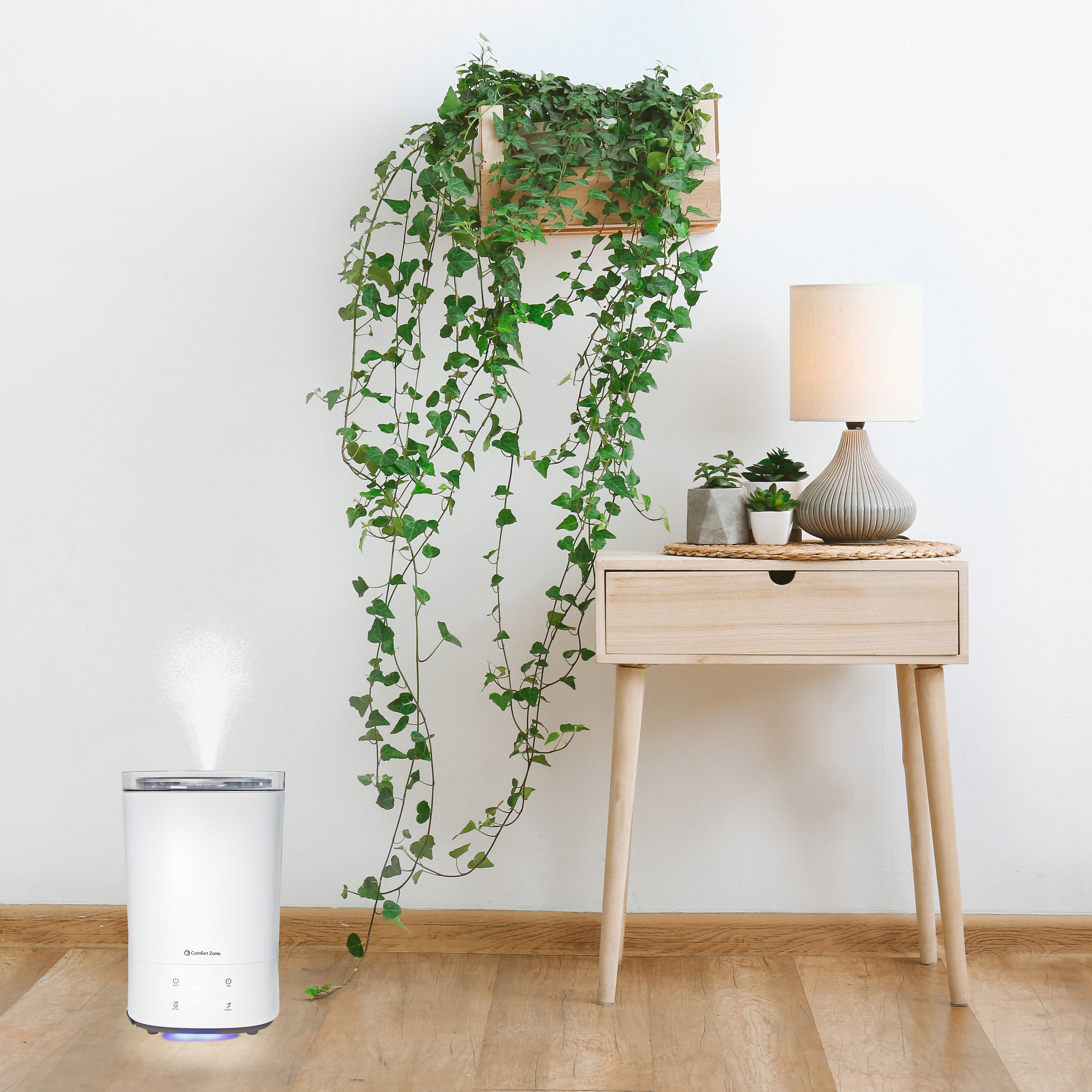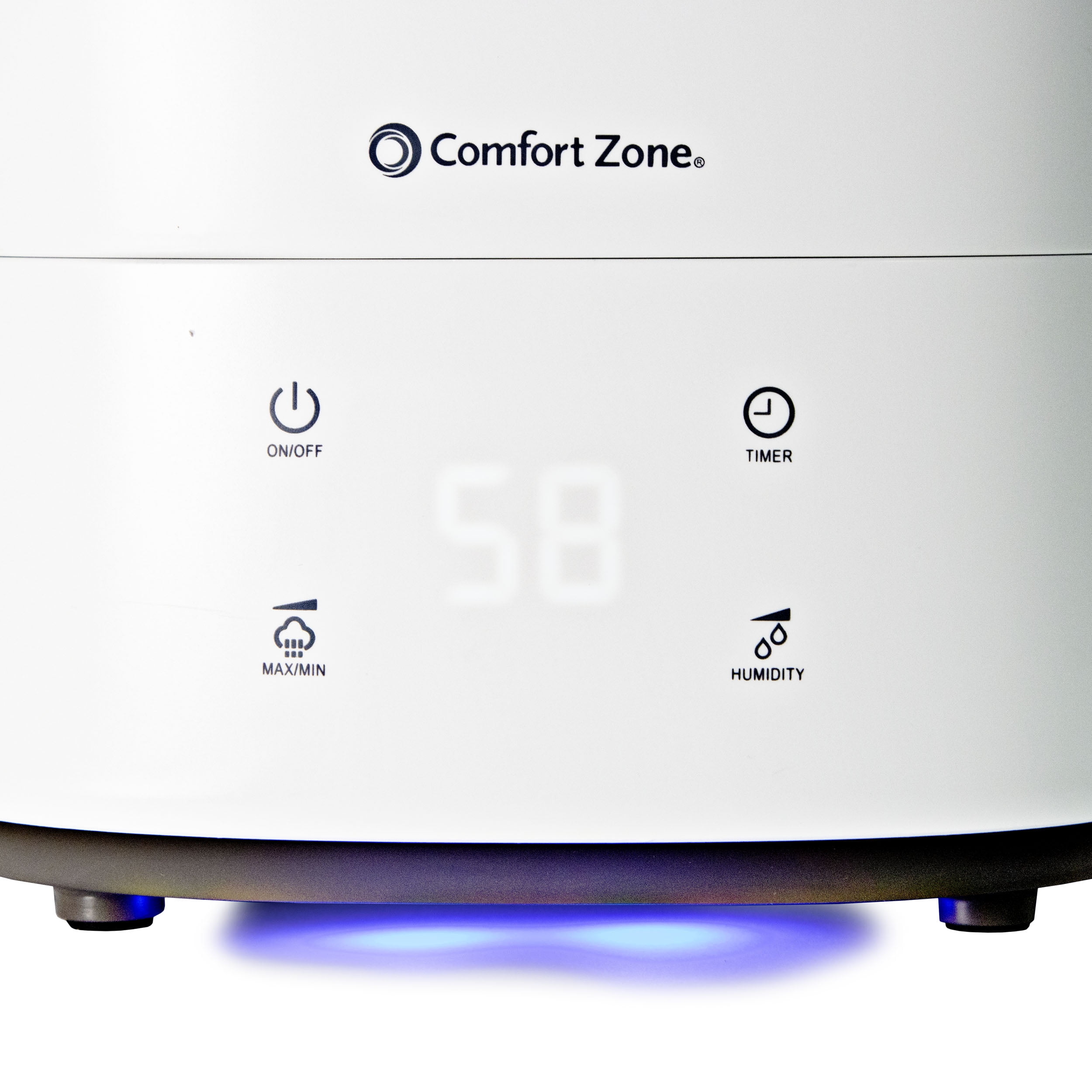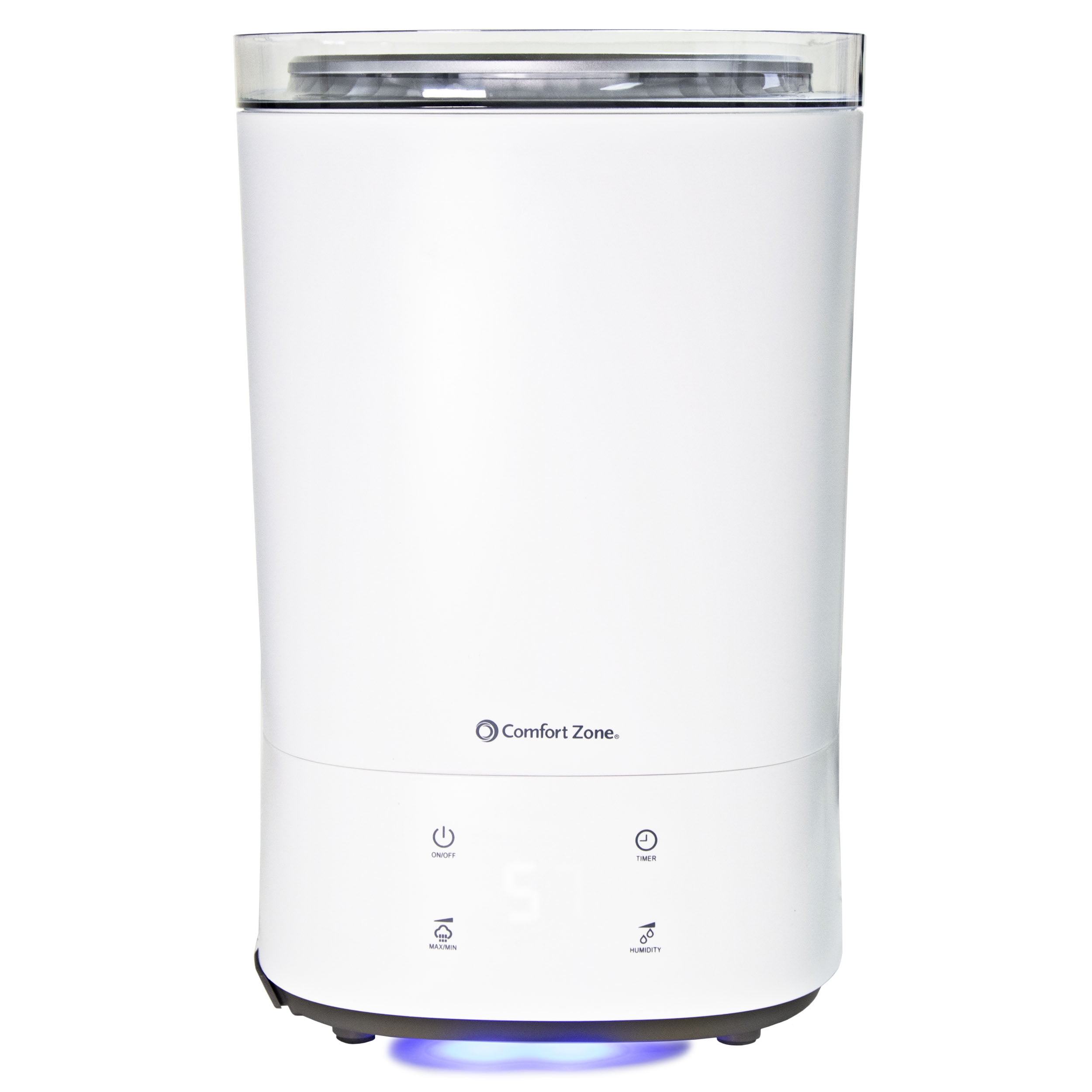 This H2 Brands Group Comfort Zone Ultrasonic Aromatherapy humidifier makes it easy to add moisture and fragrance to dry air. Perfect for a desktop or nightstand, this whisper-quiet ultrasonic humidifier emits a soothing, fragrant, cool mist to relieve the discomforts of nasal congestion, itchy skin, chapped lips and dry throat. It comes with a variety of features such as touch panel digital controls, 3 adjustable mist levels, a humidistat to automatically monitor and maintain the relative humidity in the air, nightlight on/off function, a 12 hour timer and a top-fill tank to easily fill with water. This humidifier comes equipped with a lower tray that has a reusable fragrant oil sponge and built-in aroma therapy diffuser so you can add your own oils for aromatherapy, creating a calm and stress free environment. Simply fill the tank with water, and it works for up to 36 hours, then shuts off automatically when it’s empty. The auto-shut off features also works when the water tank is removed from the base. This easy to clean humidifier with visible cool mist, is perfect for small to medium size rooms.