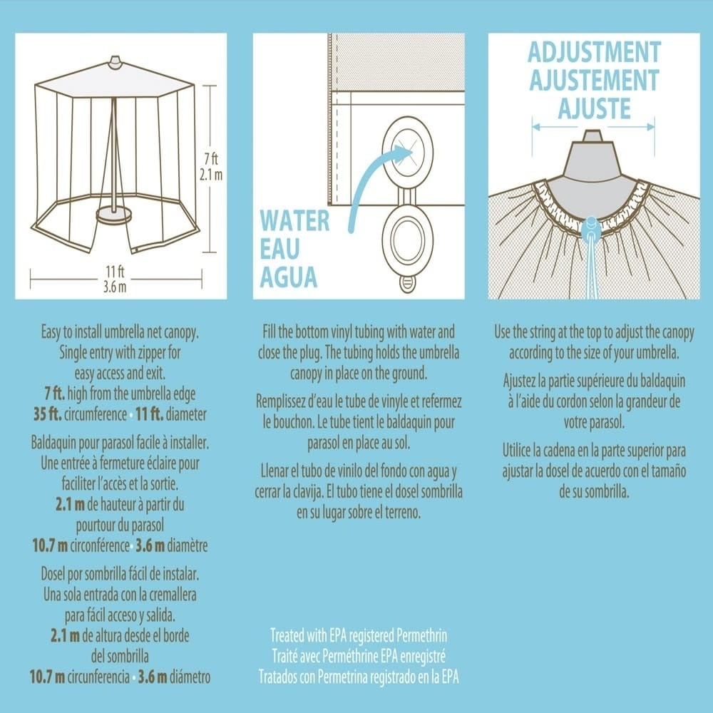 Scram Outdoor Umbrella Screen 7×11 White – This umbrella screen is made of a lightweight netting, designed to set up easily over patio umbrellas with a cinch top, its see-through mesh construction won’t obstruct your view. The netting is infused with an EPA registered natural mosquito repellent (Permethrin), it not only deters mosquitoes from getting into your outdoor living area, it repels them from it all together. The easy to fill bottom tube that runs the circumference of the bottom net securely keeps the netting in its desired location. Single entry, with heavy-duty zipper makes it very easy access in and out of your new party environment. Now you can enjoy your outdoor cookouts and parties without having to worry about mosquito bites or flies all over your food.