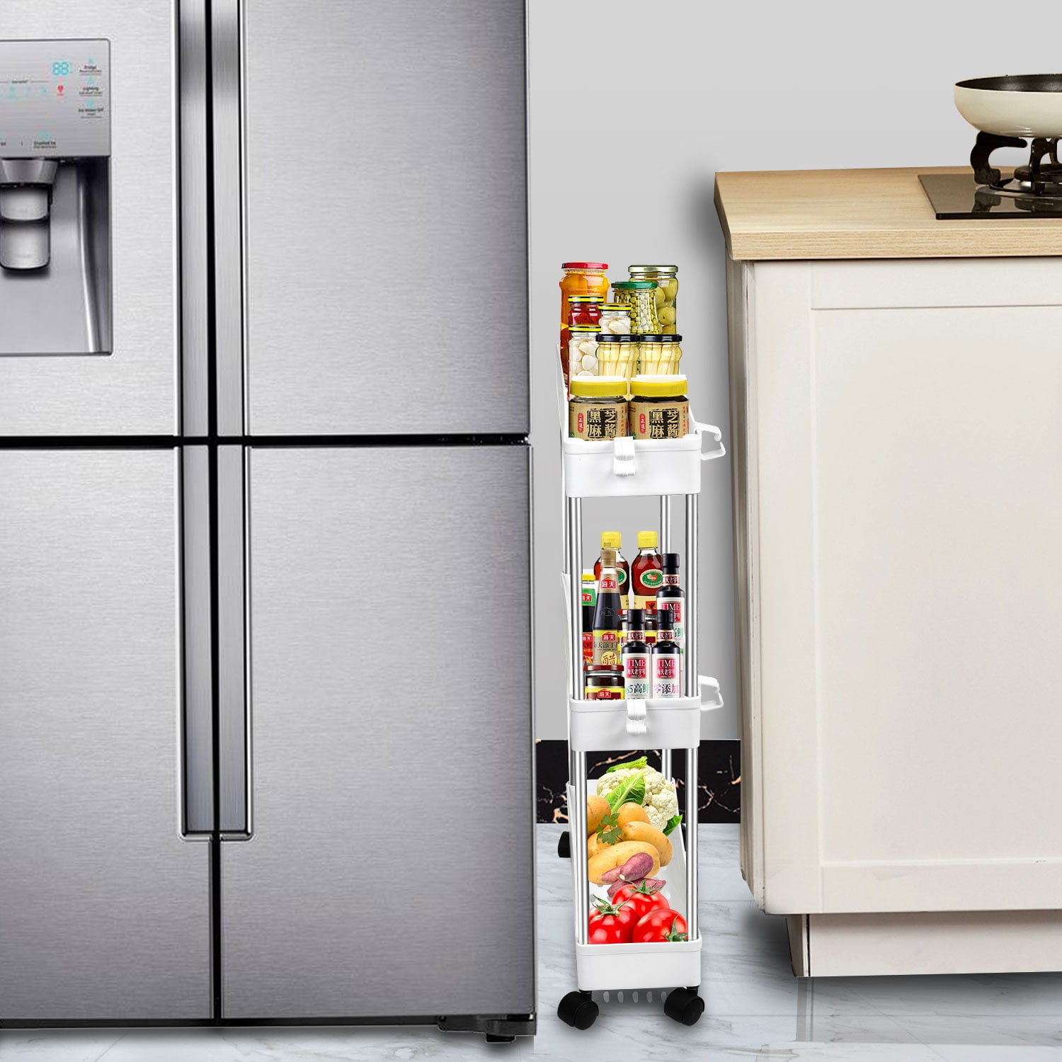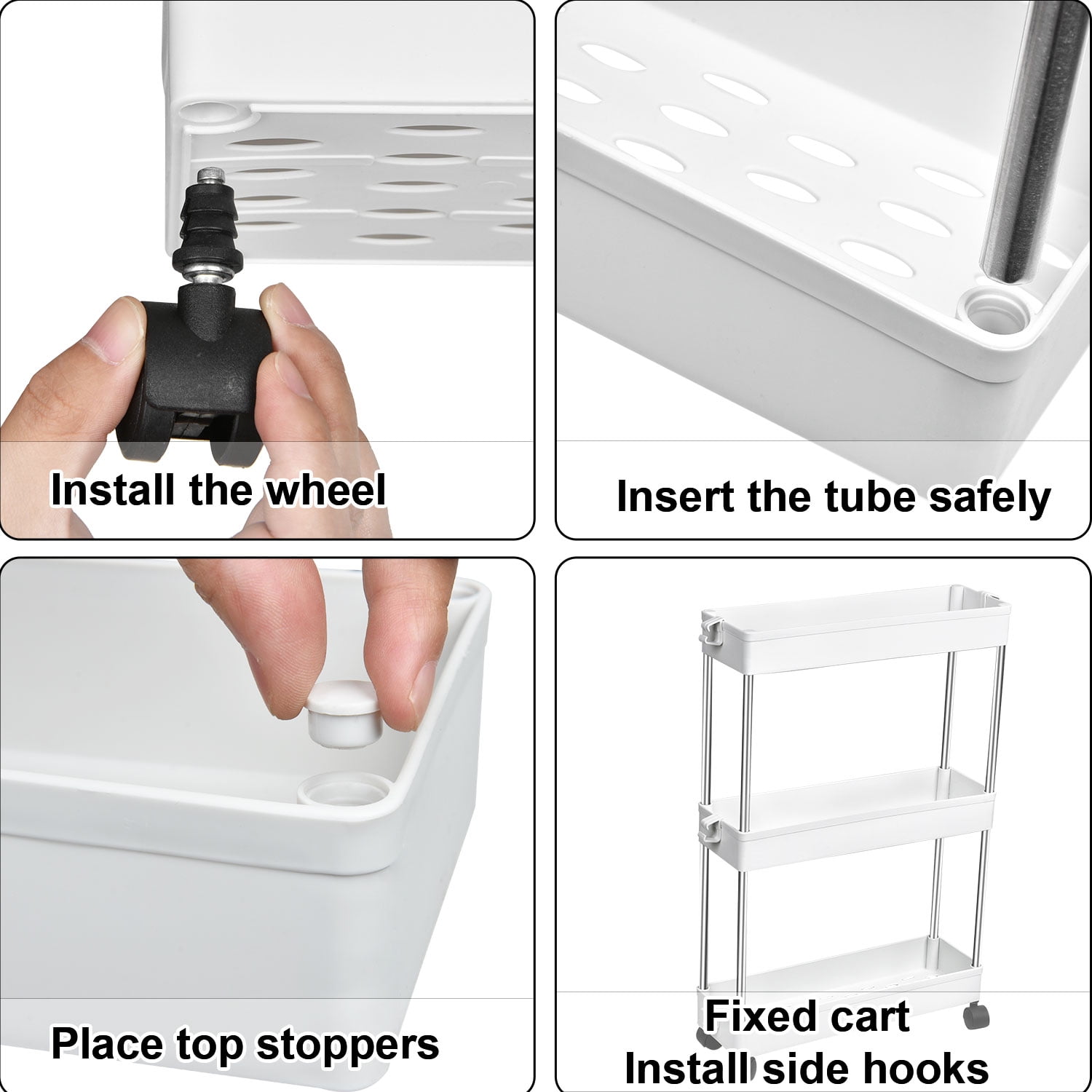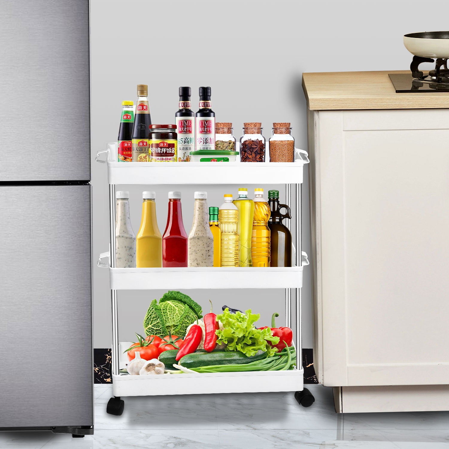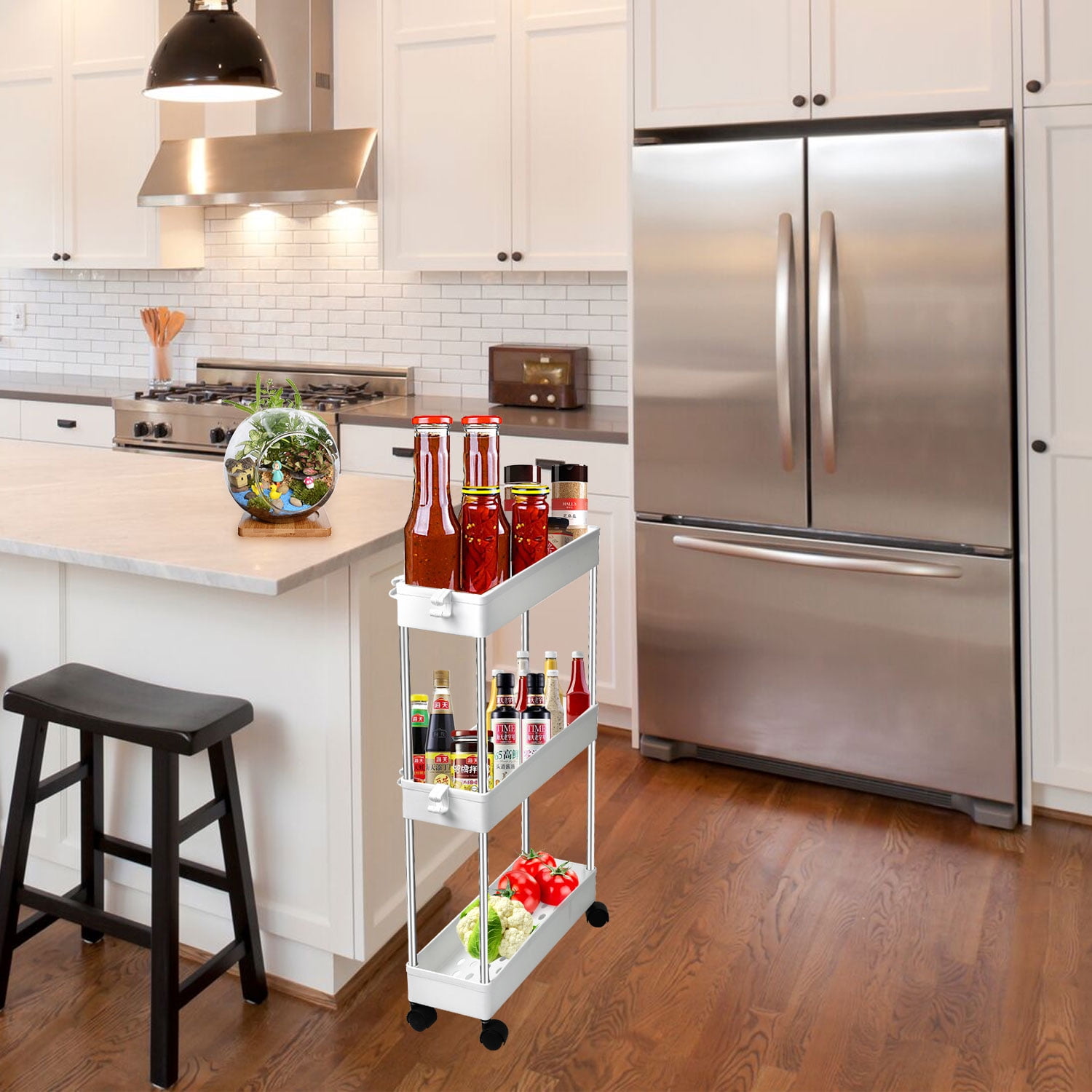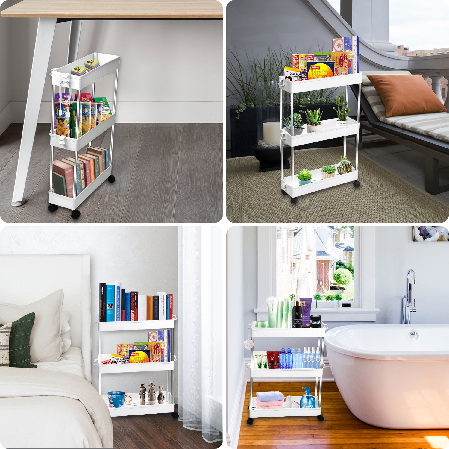 Coolmade 3 Tier Slim Storage Cart Mobile Shelving Unit Organizer Slide Out Storage Rolling Utility Cart Tower Rack for Kitchen Bathroom Laundry Narrow Places, Plastic & Stainless Steel, White