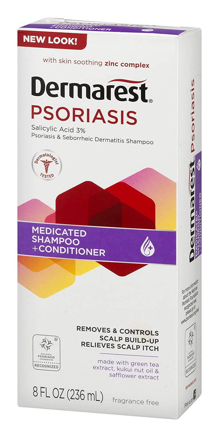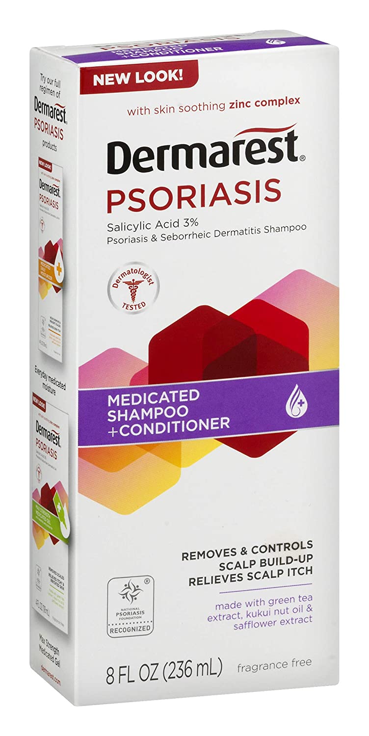 Dermarest Psoriasis Medicated Shampoo Plus Conditioner with 3% salicylic acid and zinc complex is specially formulated to Go Beyond the Itch and treat the flaking and itchy scalp symptoms of psoriasis. This fragrance free formula’s rich lather works directly on the scalp, removing and controlling scalp build up of scales, soothing irritation, eliminating itching and restoring moisture to the scalp. Available in a 8 fluid ounce bottle, Dermarest Psoriasis Medicated Shampoo Plus Conditioner is Dermatologist tested and recognized by the National Psoriasis Foundation. Trust Dermarest for strong targeted psoriasis symptom relief.