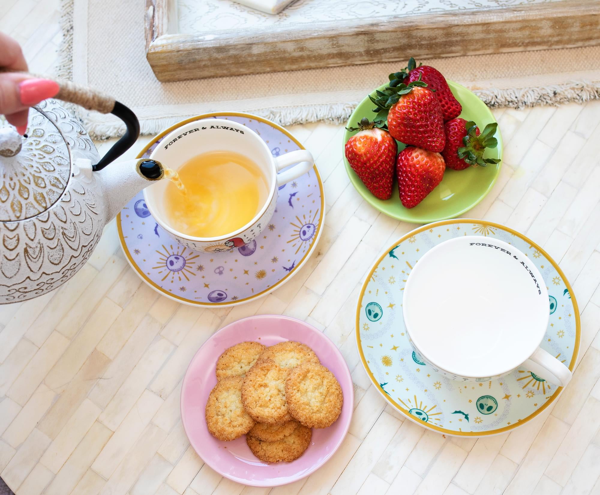 - WHAT’S INCLUDED: This mini tea set comes with two place settings, complete with 2x teacups and 2x saucers. Enjoy your preferred beverage of choice, like a serving of Worm’s Wort brew with the Jack to your Sally.