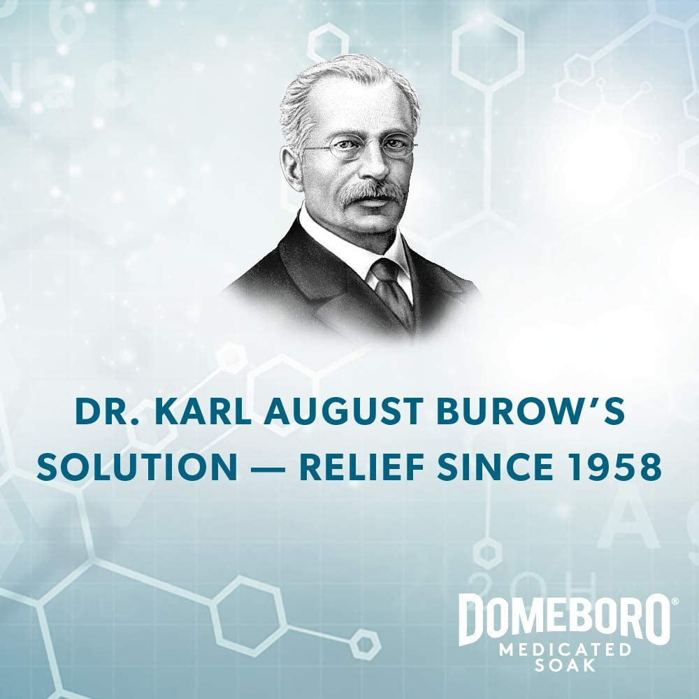 Domeboro Soothing Soak is effective for a variety of itchy, skin rashes such as poison ivy, poison oak, poison sumac, and insect bit’s (mosquito, chigger, spider, bed bug and bee or wasp bit’s). It is also effective for allergic skin reactions (contact dermatit’s) from jewelry, soaps, fragrances or detergents and even athlete’s foot. Domeboro provides fast itch relief plus visible healing of rashes by drying out the rash, reducing redness and reducing blistering. It is an advanced version of the original Burrow’s Solution and has been trusted and recommended by doctors for over 50 years. Domeboro provides complete rash relief by quickly soothing itchy, irritating rashes while also aiding the healing process so that your skin can get back to normal faster.