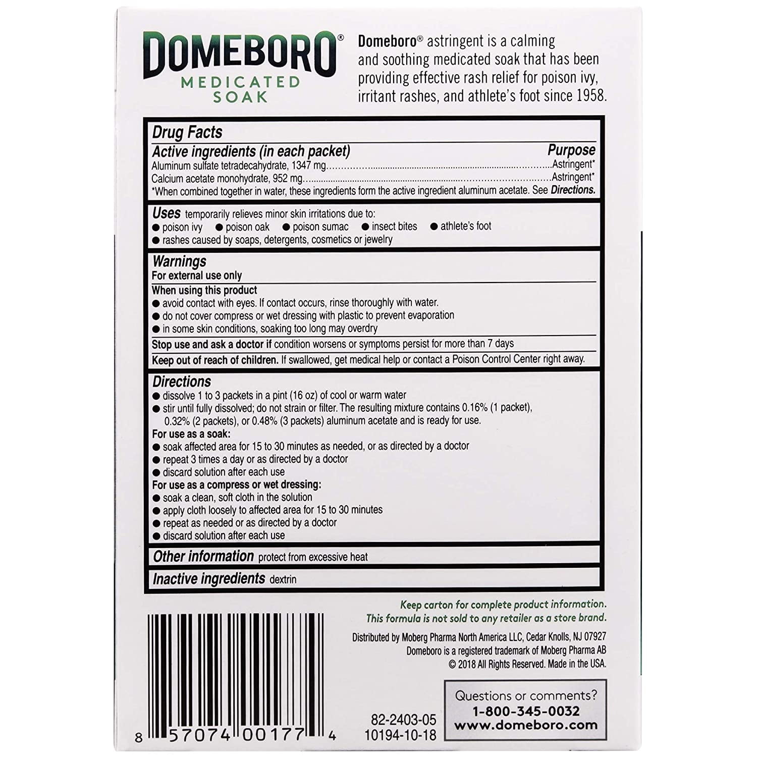 - MEDICATED SOAK: Use Domeboro astringent powder as a soak, compress, or wet dressing treatment & help relieve the itching & discomfort of poison ivy, dermatitis, athlete’s foot, & other skin irritations