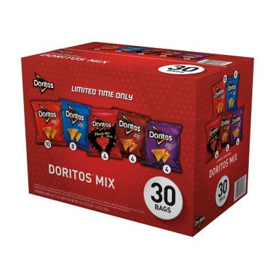 Doritos isn’t just a chip. It’s fuel for disruption. With everycrunch, Doritos aims to redefine culture and support those who are boldlythemselves. Are you ready? If so, crunch on. This 30=count Doritos Mixvariety pack includes five of your favorite Doritos flavors: Nacho Cheese,Cool Ranch, Flamin’ Hot, Spicy Nacho and Spicy Sweet Chili. Thesesnack-size bags are perfect for enjoying at home, at work or on-the-go.PepsiCo is one of the world’s leading food and beverage companies servingmore than 200 countries and territories around the world. For more than 50years, as tastes, trends and lifestyles have changed, PepsiCo has evolvedwith them. Their willingness to adapt and grow has transformed our snackand soda company into a collection of global brands. Today, PepsiCo makessome of the most popular and high-quality foods and beverages in the UnitedStates. They create smiles for their consumers — currently more than 1billion a day — creating joyful moments through delicious, nourishingproducts and unique brand experiences. They also bring smiles to peoplearound the world by conserving nature’s precious resources and fostering amore sustainable planet for future generations. Policies &plansSpecifications 30 bags – 1.75 ounces each Variety pack includes:Doritos Nacho Cheese flavored tortilla chips (10 count) Doritos Cool Ranchflavored tortilla chips (8 count) Doritos Flamin’ Hot Nacho flavoredtortilla chips (4 count) Doritos Spicy Nacho flavored tortilla chips (4count) Doritos Spicy Sweet Chili flavored tortilla chips (4 count) Netweight: 3.28 pounds (52.5 ounces) WarrantyThis product is covered by theSam’s Club Member Satisfaction Guarantee. Assembled CountryUnitedStatesAssembled Size 15.75" x 11.63" x 9.81" Component CountryUSAShippingInfoStandard – 2 to 6 business days Premium – 2 to 5 business days Deliverynot available to Alaska, Hawaii, or Puerto Rico Additional InfoForadditional questions or concerns regarding this product, please contact theManufacturer’s Customer Service Department at: (800) 352-4477 &https://contact.pepsico.com/fritolayYour favorite Doritos flavored tortilla chips in snack-size bags Perfect for snacking at home or on-the-go