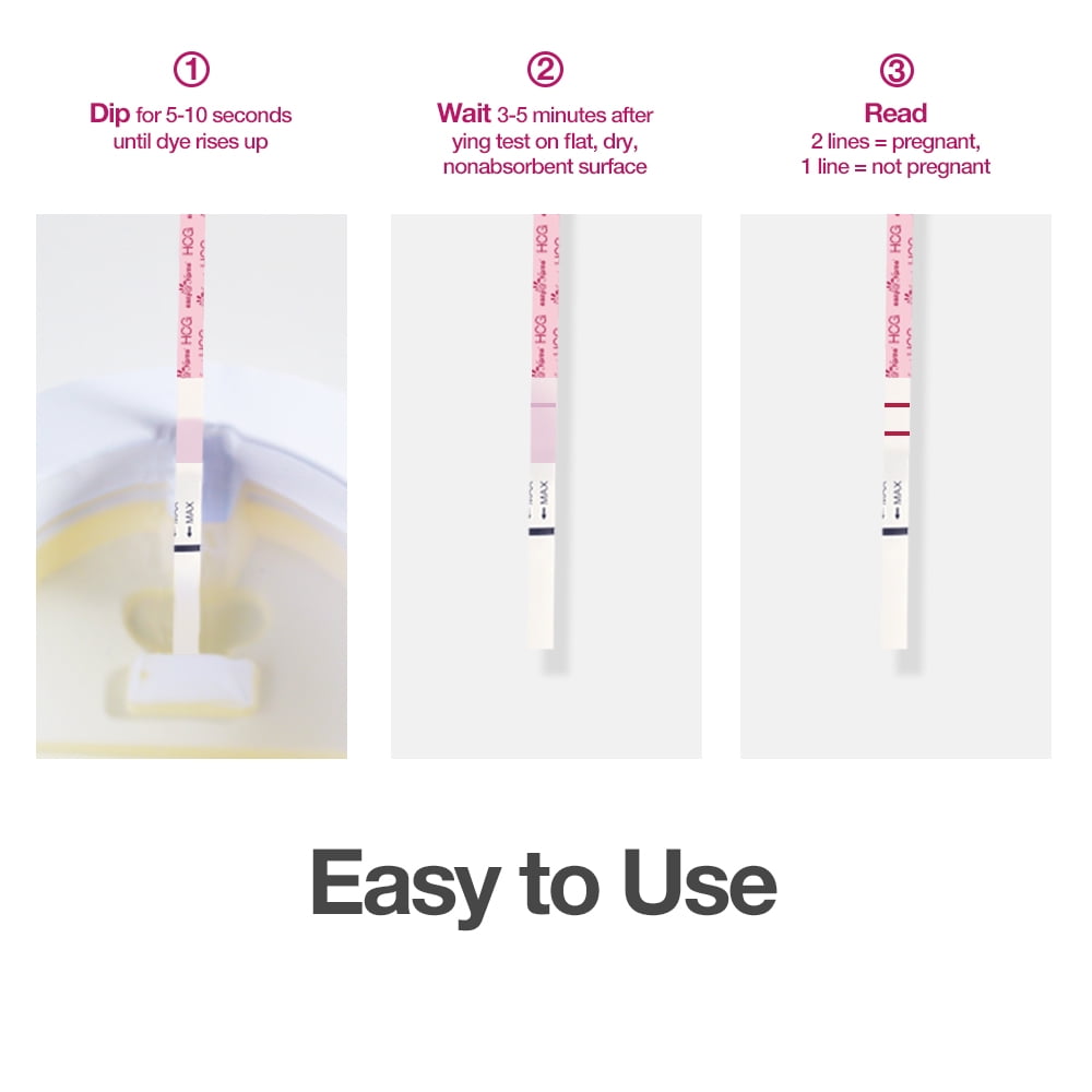 - Easy to test : simply dip the test in urine for few seconds; Easy to read: two lines means pregnant and one line means not pregnant ;