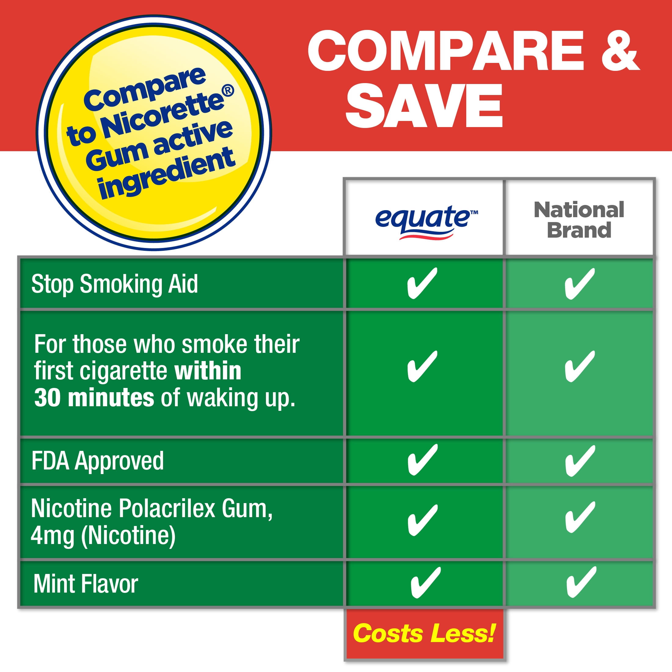 - Effective nicotine gum: For those who smoke their first cigarette within 30 minutes of waking up. If you smoke your first cigarette more than 30 minutes after waking up, use Equate Nicotine Polacrilex Coated Gum, 2 mg