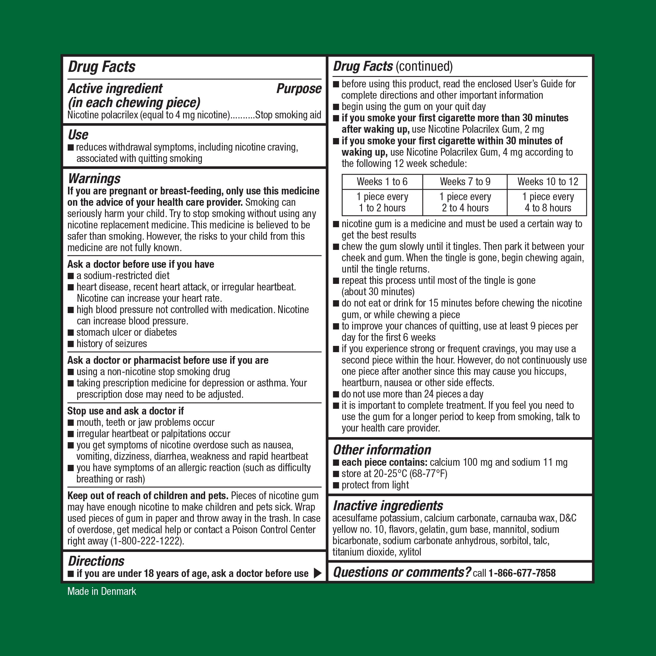 Compare to Nicorette Gum active ingredient. Double your chance to successfully quit smoking with Equate Nicotine Coated Gum 4 mg (when used as directed with a support program. Many people require several quit attempts to stop smoking). Equate Nicotine Coated Gum 4 mg, Mint Flavor, is a stop smoking aid for those who smoke their first cigarette within 30 minutes of waking up. This product is part of a Nicotine Replacement Therapy, which is designed to wean your body off cigarettes. It helps to regulate, control and gradually reduce your body’s nicotine cravings to help you on your journey to quit smoking. This nicotine gum contains nicotine polacrilex, a stop smoking aid, which compares to the active ingredient in Nicorette Gum. Smoking has two addictive components, a physical and a mental need for the nicotine in tobacco. Equate Nicotine Coated Gum 4 mg addresses the physical need to smoke by reducing withdrawal symptoms, including nicotine cravings. So, why not give quitting a chance when you have the support and refreshing flavor of Equate Nicotine Coated Gum 4 mg? This product does not contain gluten.