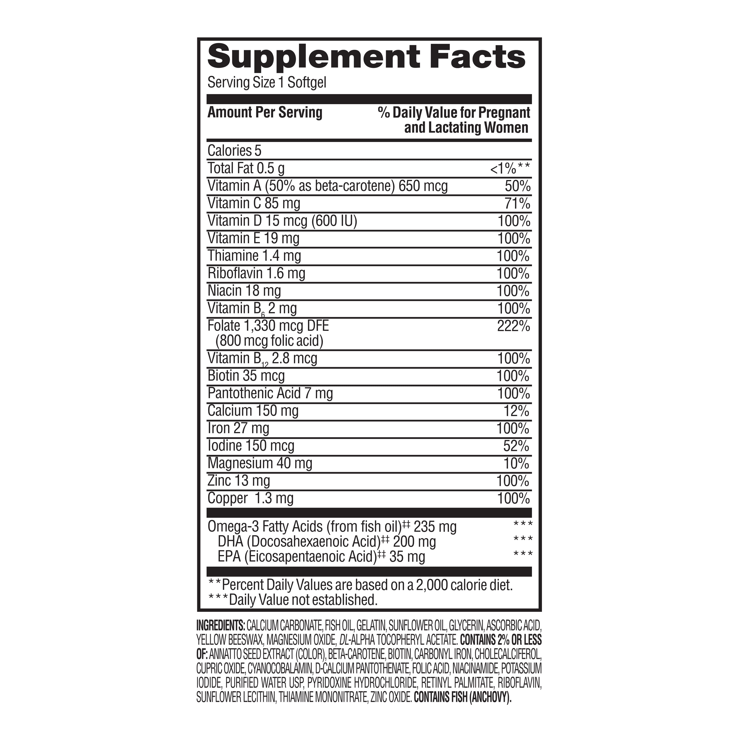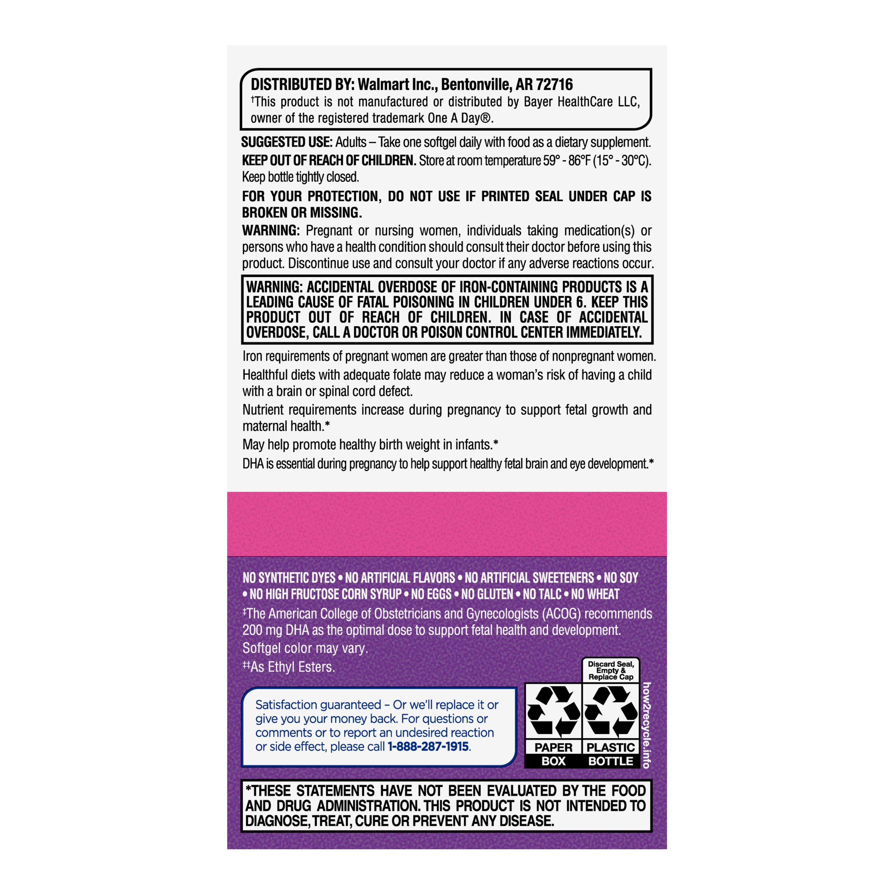 Our Equate One Daily Prenatal Softgels Multivitamin/Multimineral Supplement is specifically formulated to provide nutritional support before, during pregnancy, and while breastfeeding.* These one-per-day softgels deliver a blend of essential nutrients including iron, folate, and OB/GYN recommended amount of DHA to help fulfill nutrient requirements that increase during pregnancy.** Healthful diets with adequate folate may reduce a woman’s risk of having a child with a brain or spinal cord defect.* DHA, an omega-3 fatty acid, may help support healthy genetic development and function.* DHA is essential during pregnancy to help support healthy fetal brain and eye development.* You can rest assured that our Equate One Daily Prenatal Softgels Multivitamin/Multimineral Supplement Value Pack is produced with strict quality guidelines and is backed by our quality guarantee.