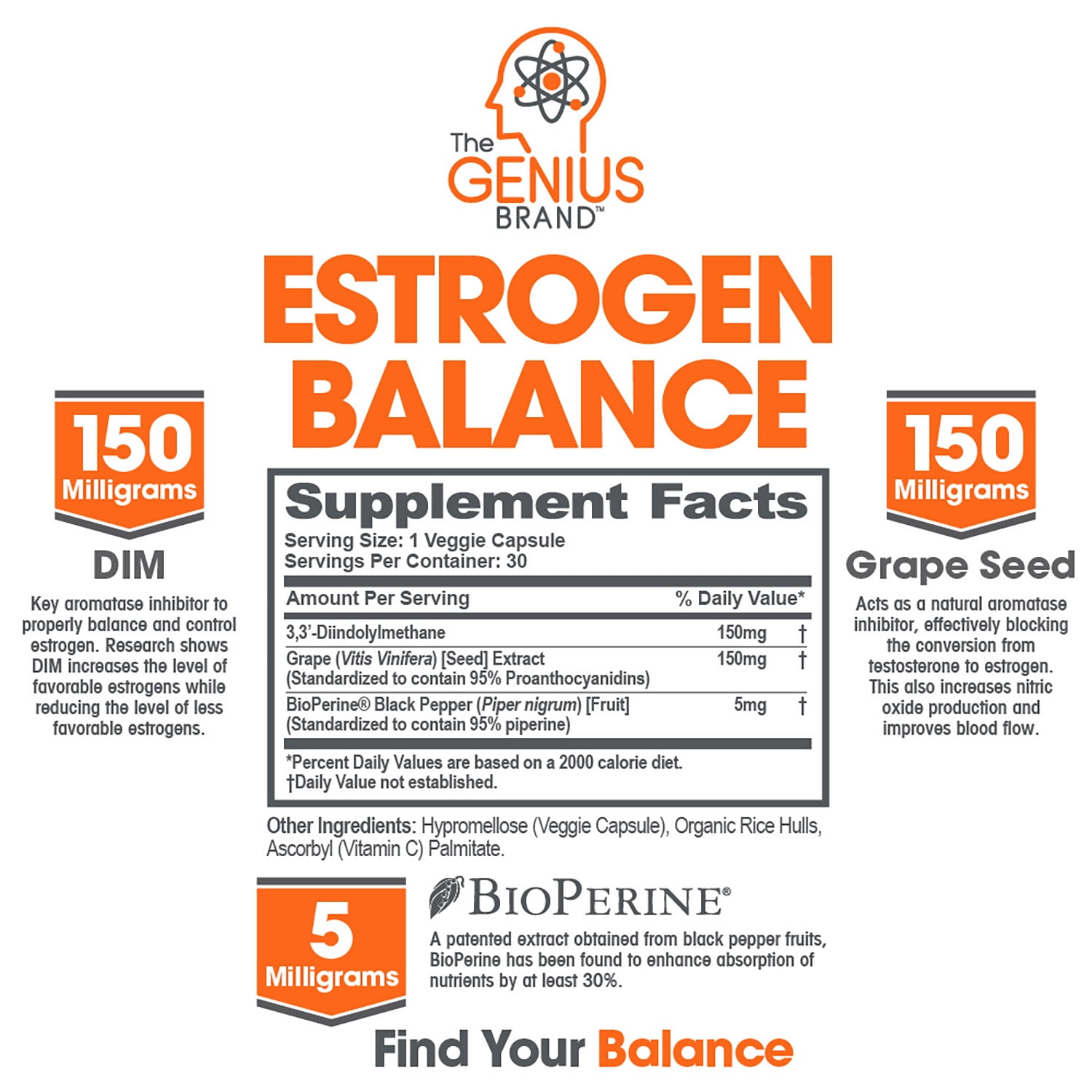 - ENHANCED DIM SUPPLEMENT – DIM, or diindolylmethane, is commonly found in broccoli and also created by the body to help address excess estrogen levels. In combination with black pepper extract (bioperine) and grape seed extract, Genius Estrogen Balance utilizes DIM to support your body in ways that can be seen and felt!