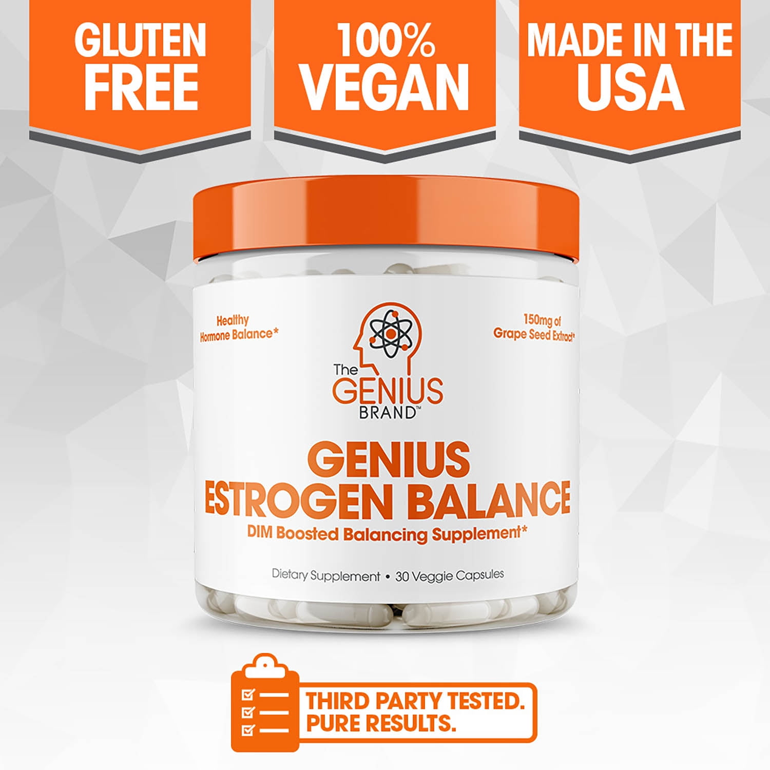 GENIUS ESTROGEN BALANCE offers support for healthy hormone levels, adrenal energy, and a natural way to beat the bloat!* Genius Estrogen Balance’s formula benefits both men and women via natural ingredients with estrogen modulating capabilities, including Grape Seed and Diindolylmethane (DIM).* Scientists have found that diindolylmethane can favorably influence the body’s metabolism of estrogen for optimal results.* DIM is one of the most potent supplements available for fighting cystic acne. Fight acne from the inside out with true hormonal balance. With absolutely no synthetic drugs or chemicals, Genius Estrogen Balance works with your body to regulate proper function and eliminate white heads, black heads and acne of all kinds. Genius Brand Estrogen Balance is also a potent bodybuilding supplement because it is an aromatase inhibitor. While bodybuilders often use it as a key piece of their PCT regimine, every guy’s physique stands to "harden up" with less excess estrogen. Tired of excess cortisol and belly fat? YES! This DIM Supplement is the product for you.