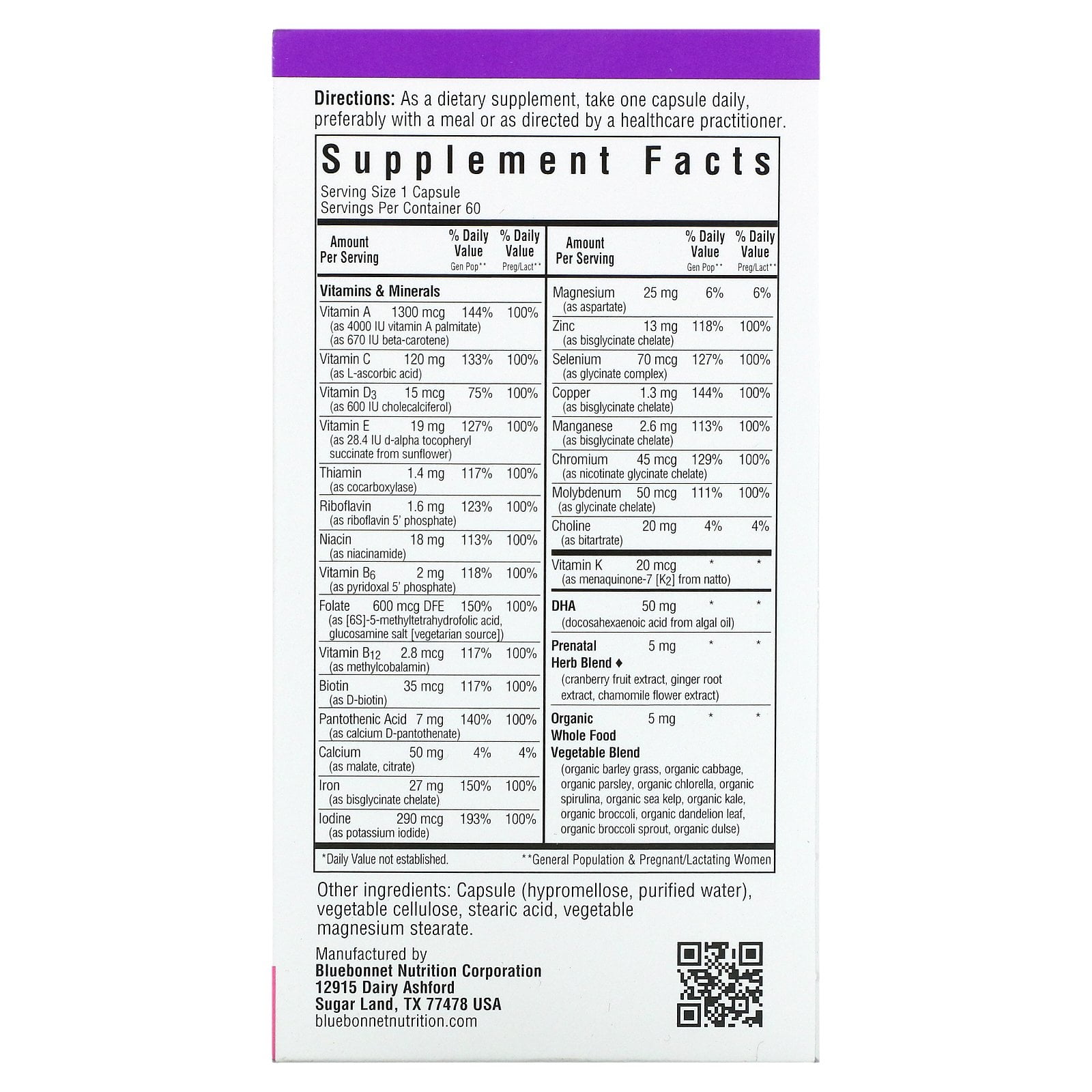 Vitamin A (as beta carotene) 1200 mcg, Vitamin C (as ascorbic acid) 85 mg, Vitamin D3 (As cholecalciferol) 10 mcg, Vitamin E (as d-alpha tocopheryl succinate) 67 mg, Thiamin (as thiamine HCI) 1.5 mg, Riboflavin 1.7 mg, Niacin 20 mg, Vitamin B6 (as pyridoxal 5-phosphate) 2 mg, Folate (as L-5-methyltetrahydrofolate, calcium) 6 mcg, Pantothenic Acid (as d-calcium pantothenate) 10 mg, Iron (as iron bisglycinate chelate) 18 mg, Iodine (as potassium iodide) 150 mcg, Magnesium (as magnesium oxide) 320 mg, Zinc (as zinc gluconate) 15 mg, Selenium (as L-selenomethionine) 70 mcg, Copper (as copper gluconate) 2 mg, Proprietary Blend 620 mg: Red Clover (Trifolium pratense) (blossom) Extract, PABA (para-aminobenzoic acid), Eleutherococcus senticosus (root) Extract, Chaste Tree Berry (Vitex agnus-castus) Extract (4:1), Ginkgo biloba (leaf) Extract. Other Ingredients: Microcrystalline cellulose, Vegetable Capsules (hydroxypropyl methylcellulose, water), Magnesium Stearate, Silicon Dioxide.