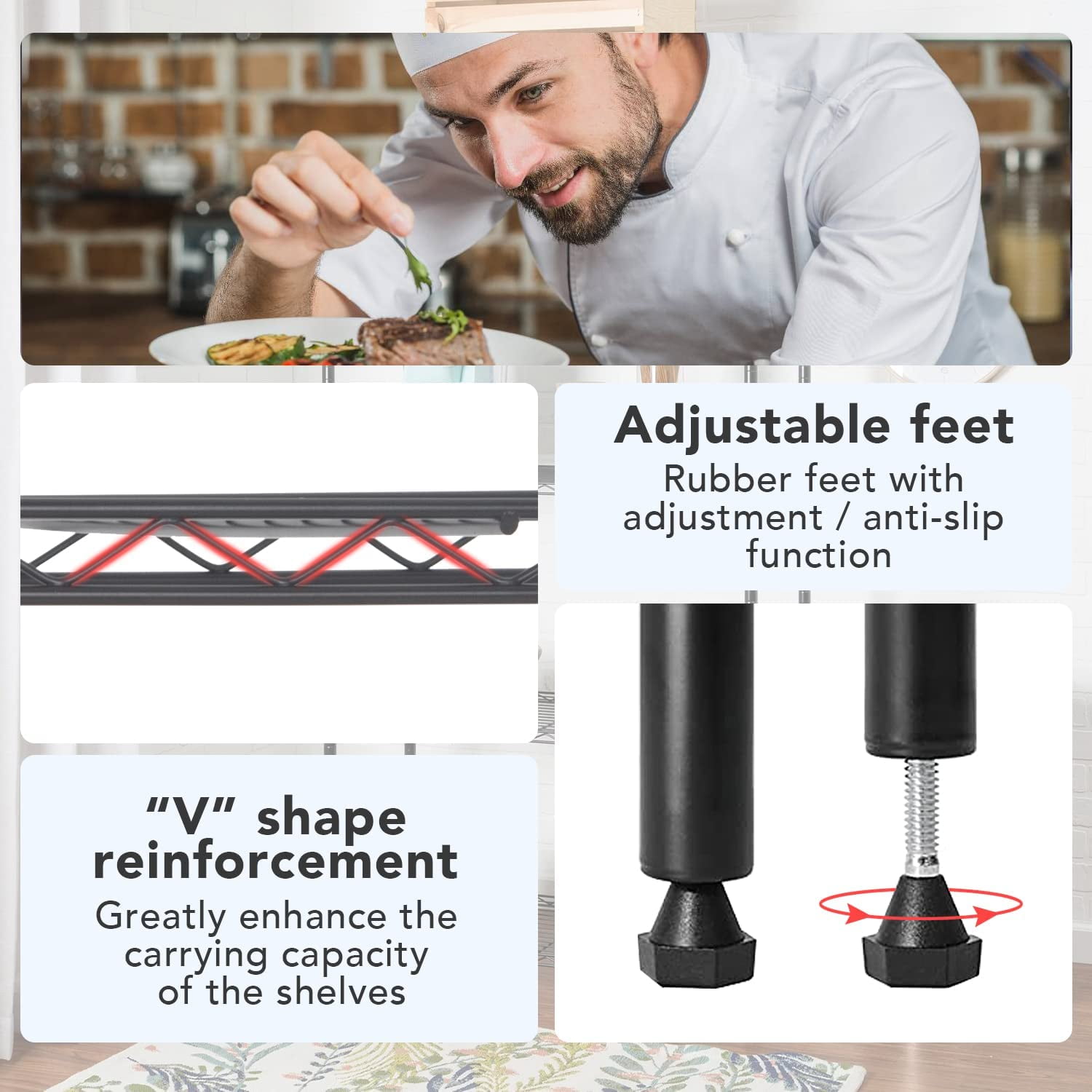 ✔【STRONG WEIGHT CAPACITY】 Each shelving can hold 150pounds (evenly distributed), and the total maximum load weight of the storage shelves for small places is 450 pounds. The appliance shelf for kitchen can put some commonly used living objects on it without worrying about the deformation of the storage shelves.